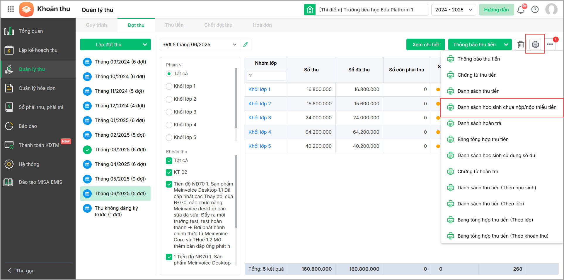 Kế toán in danh sách những học sinh chưa nộp hoặc nộp thiếu tiền trong đợt thu theo hướng dẫn chi tiết tại đây.