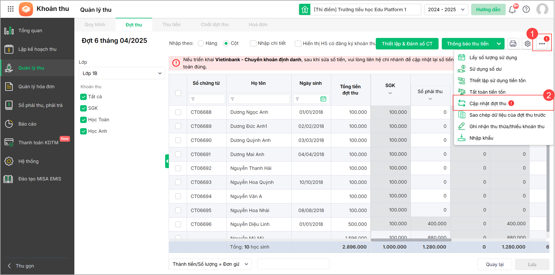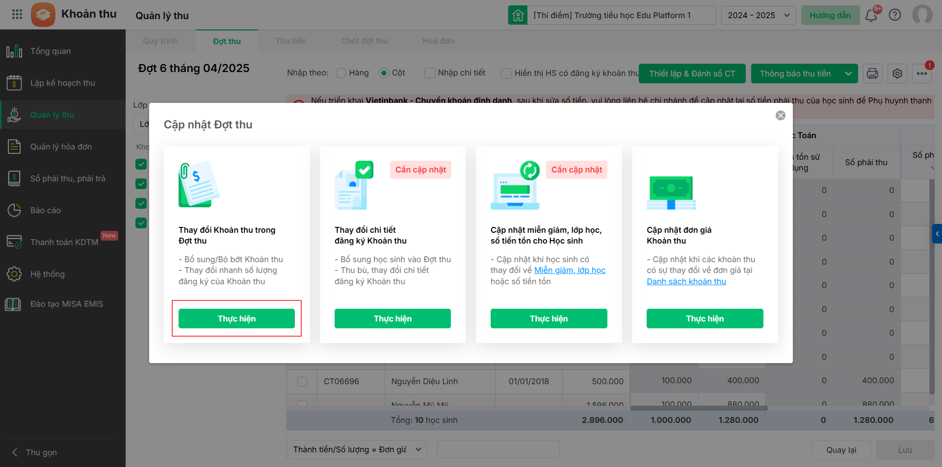 - Khi kế toán thực hiện thay đổi cần cập nhật đợt thu, phần mềm tự động rà soát và điều hướng để anh/chị dễ dàng nhận biết cần tiếp tục thao tác tại đâu để cập nhật dữ liệu chính xác.