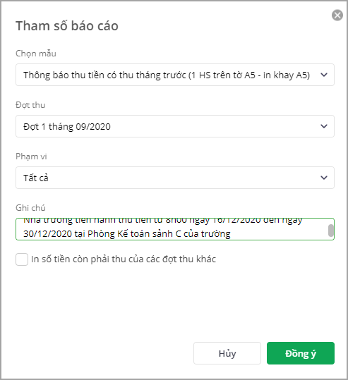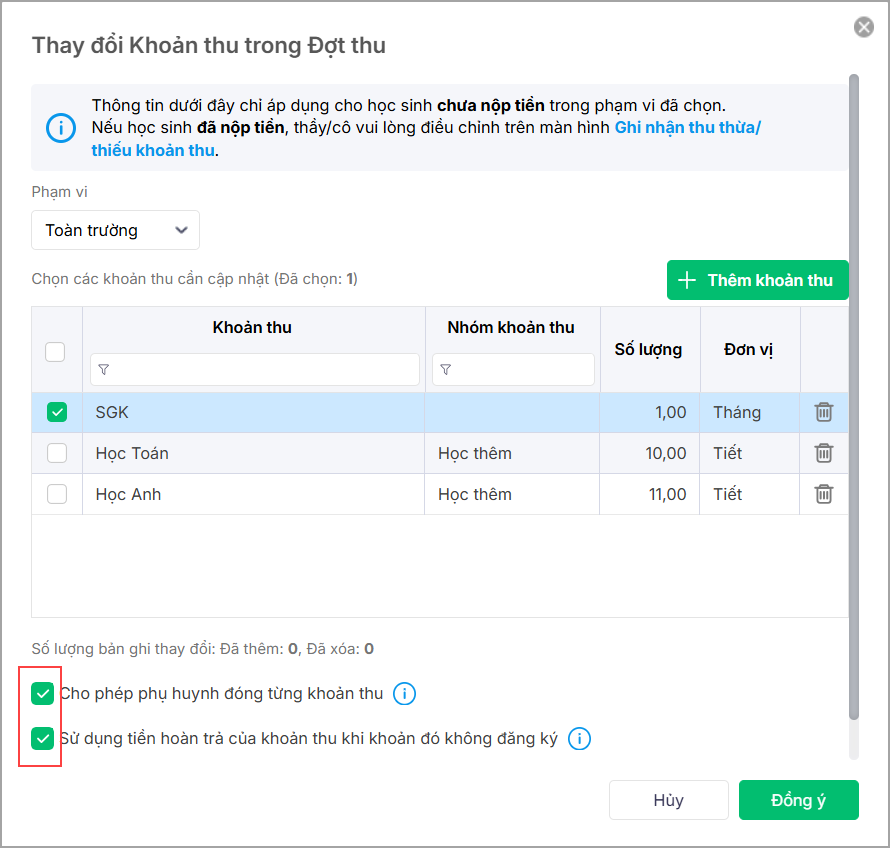 - Nhà trường có thể cho phép huynh lựa chọn và đóng từng khoản thu trong đợt theo nhu cầu nếu tích chọn Cho phép phụ huynh đóng từng khoản thu.
