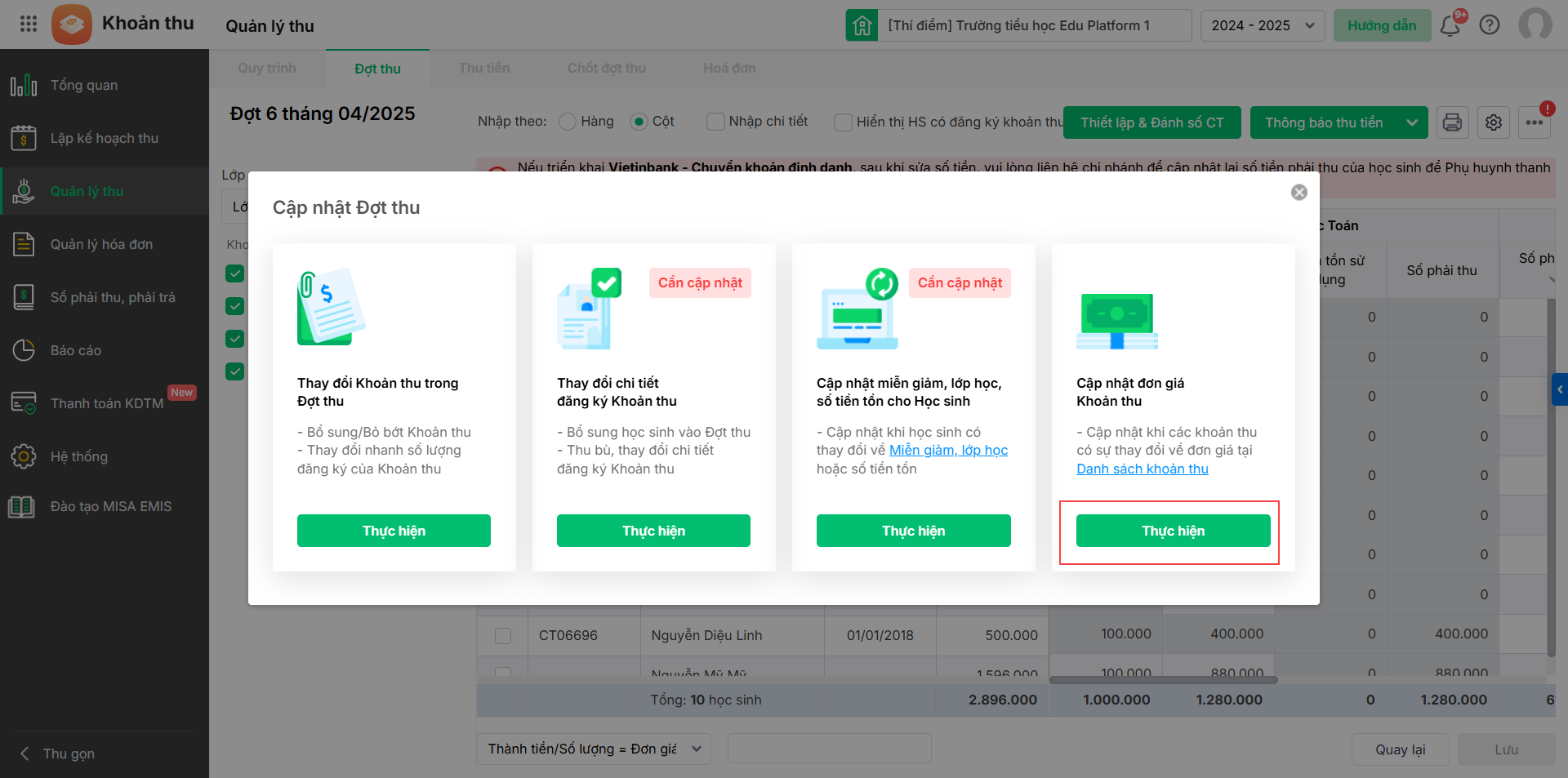 - Chọn Thực hiện tại mục Cập nhật đơn giá Khoản thu.
