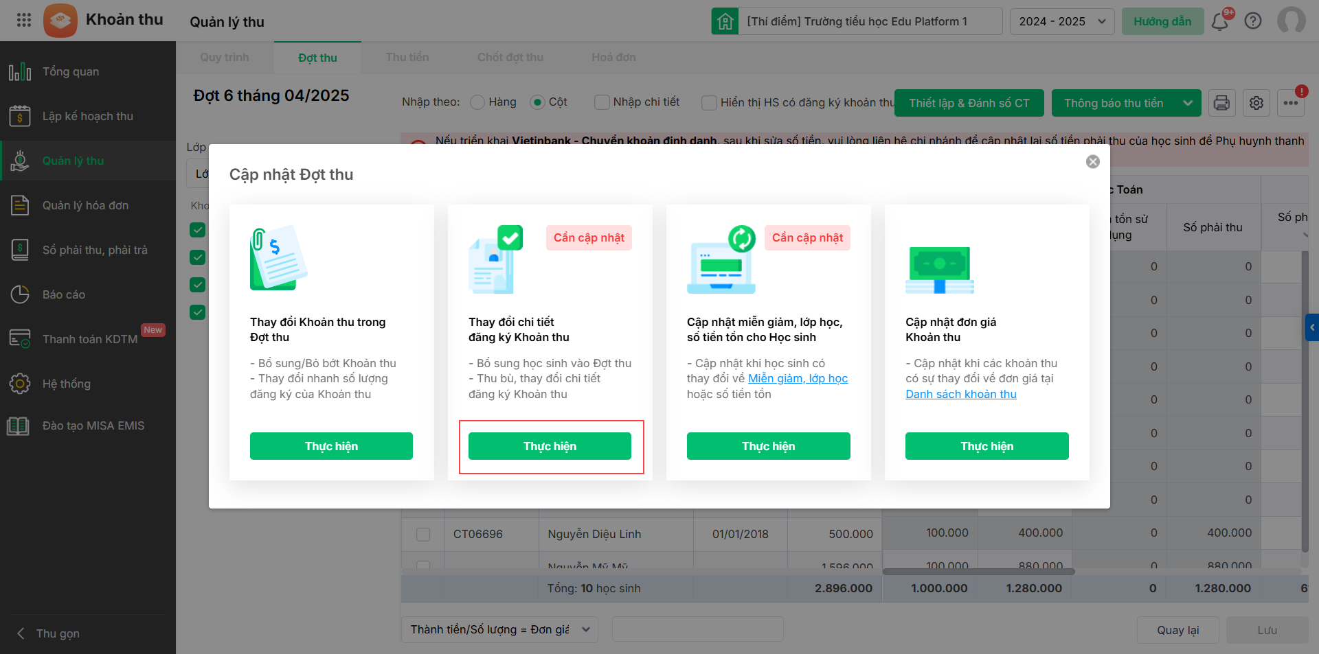 - Sau khi nhấn Lưu, màn hình hiển thị thông báo như ảnh, anh/chị chọn Cập nhật đợt thu để cập nhật những khoản thu vừa thay đổi đơn giá.