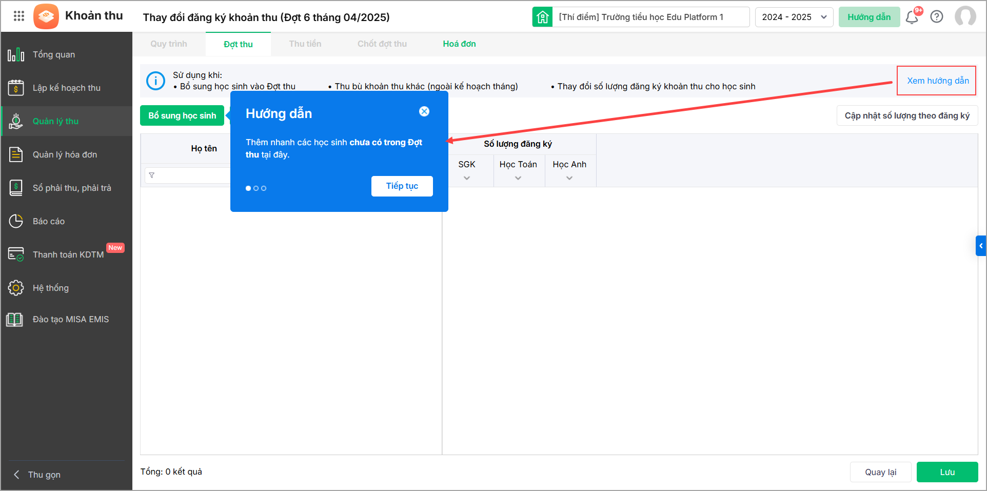 - Làm thế nào để lập đợt tạm thu tiền đầu năm mà không cần học sinh đăng ký khoản thu?