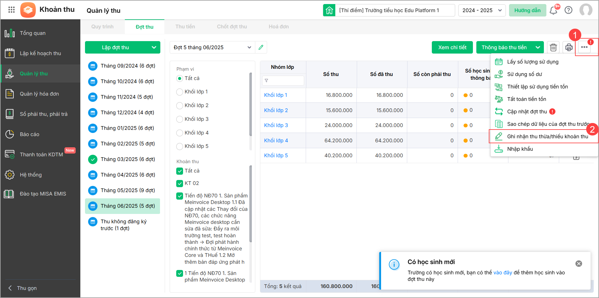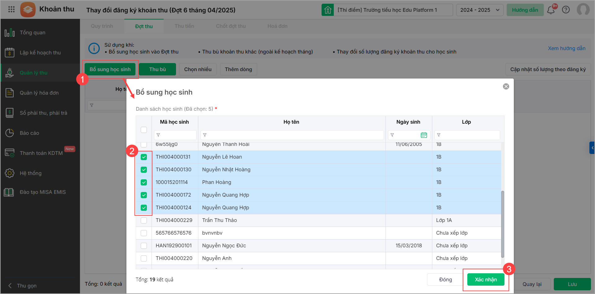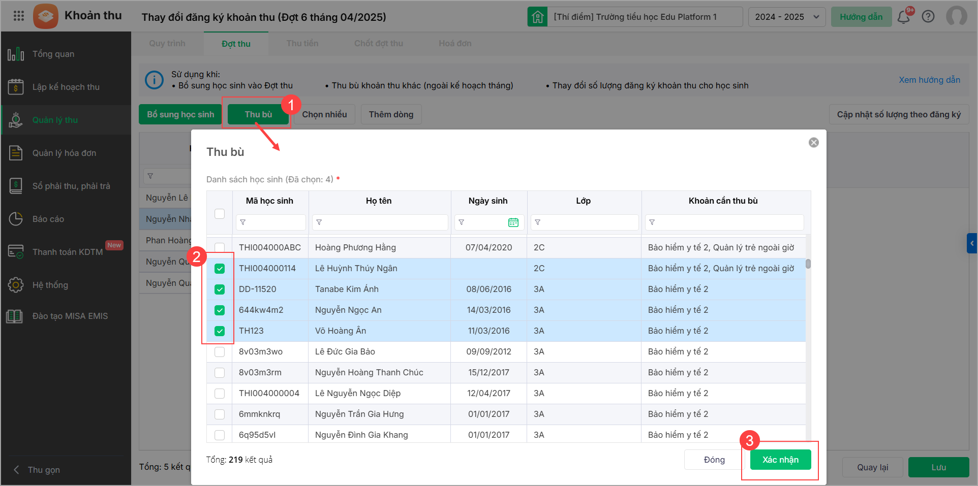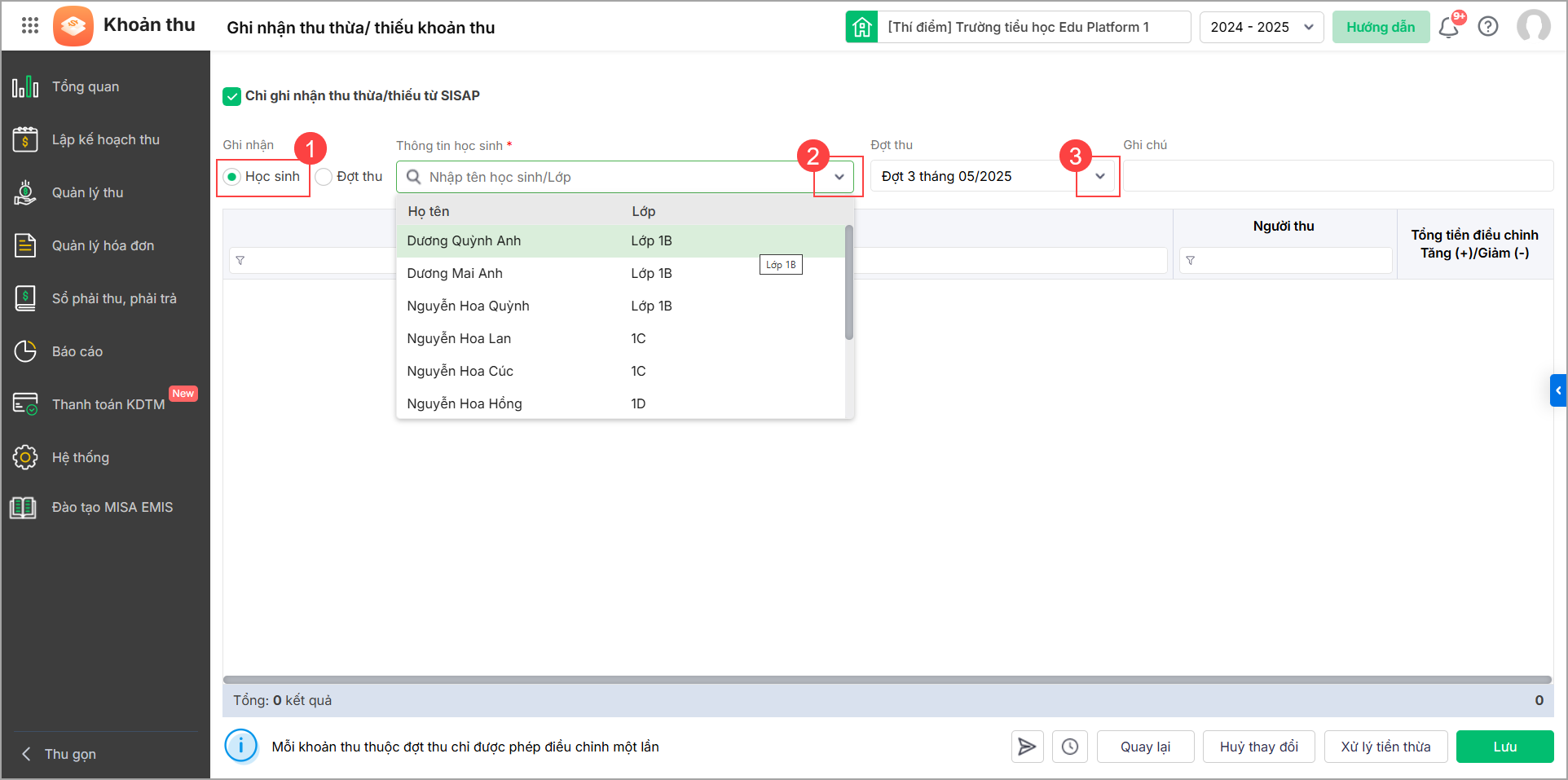 - Chọn thông tin học sinh, đợt thu cần ghi nhận.
