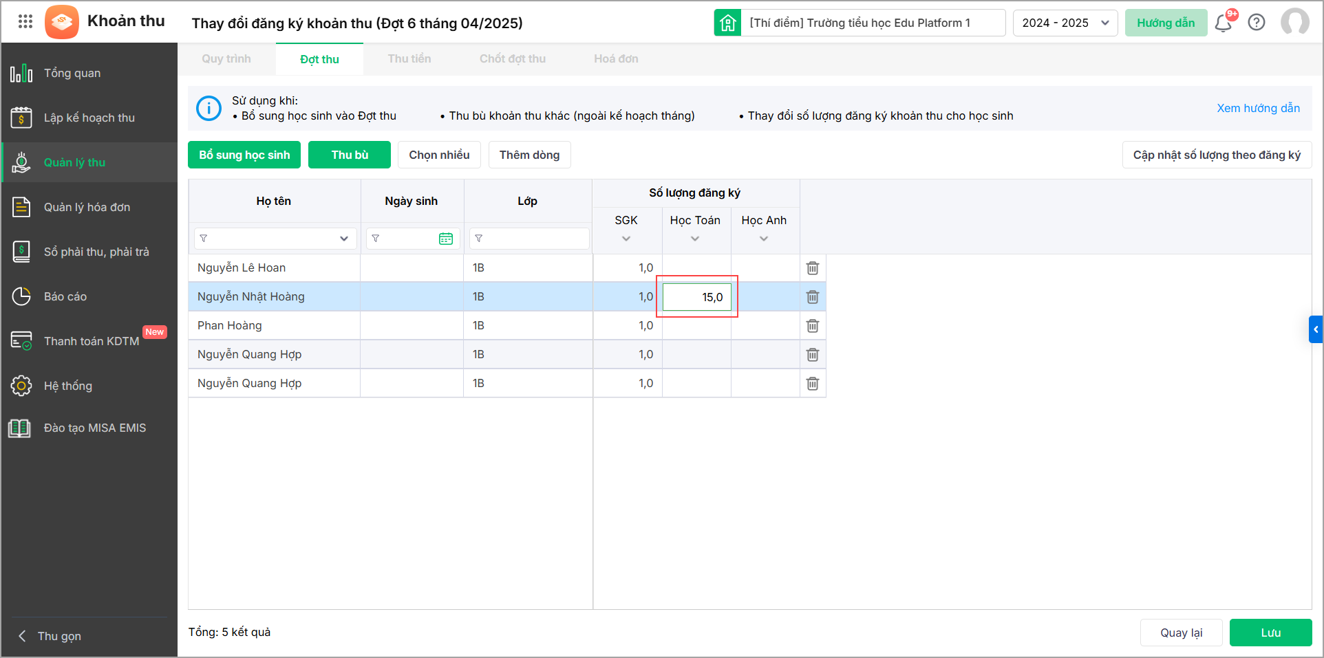 Trường hợp số lượng cần thay đổi ít thì anh/chị sửa trực tiếp số tiền cần nộp của học sinh ngay trên phần mềm.