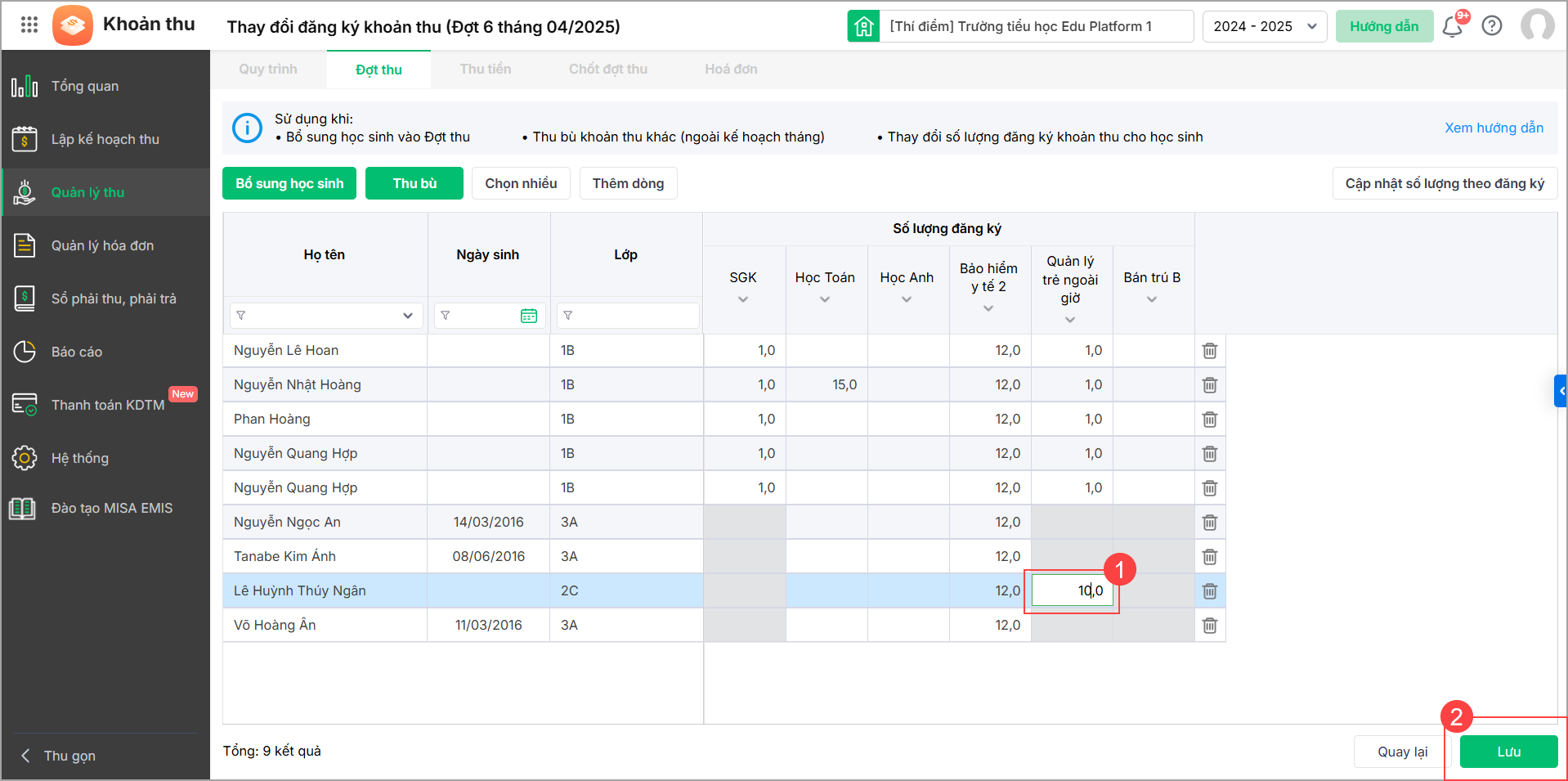 - Chỉnh sửa Số lượng cần thu bù. Tích chọn học sinh cần thu bù, nhấn Đồng ý.