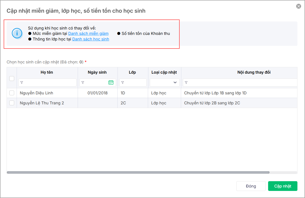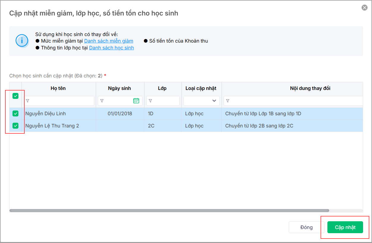 - Sau khi hoàn tất thay đổi, những học sinh cần cập nhật sẽ hiển thị trong danh sách bên dưới. Anh/chị tích chọn học sinh và chọn Cập nhật.