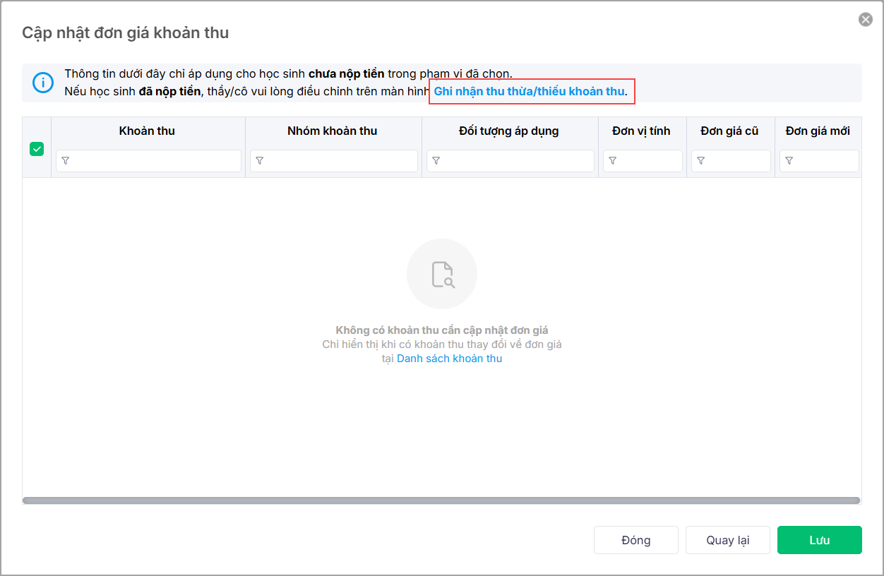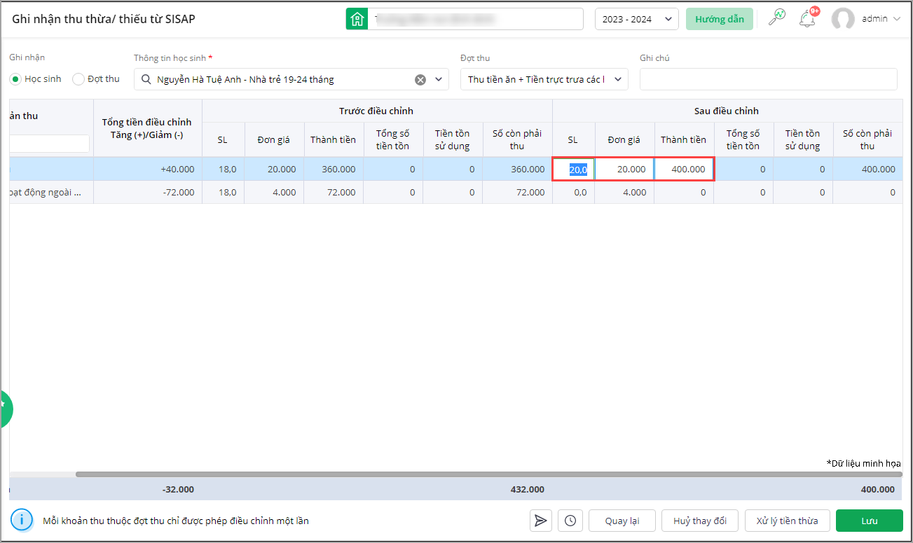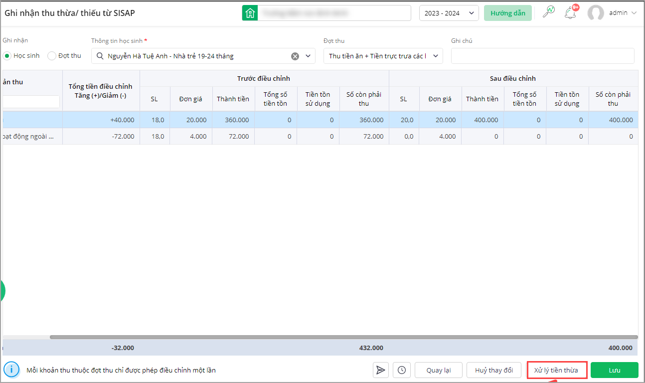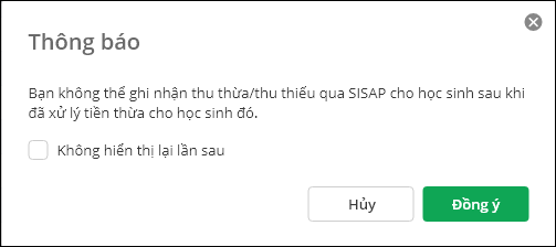 - Lưu ý: Anh/chị không thể ghi nhận thu thừa/thiếu cho học sinh nếu đã xử lý tiền thừa của học sinh đó.