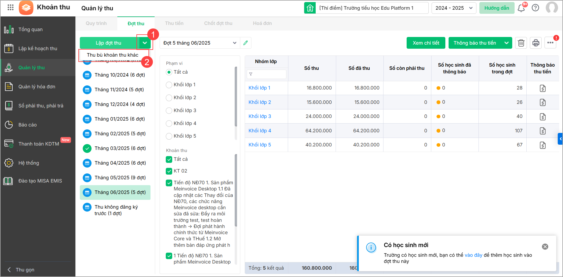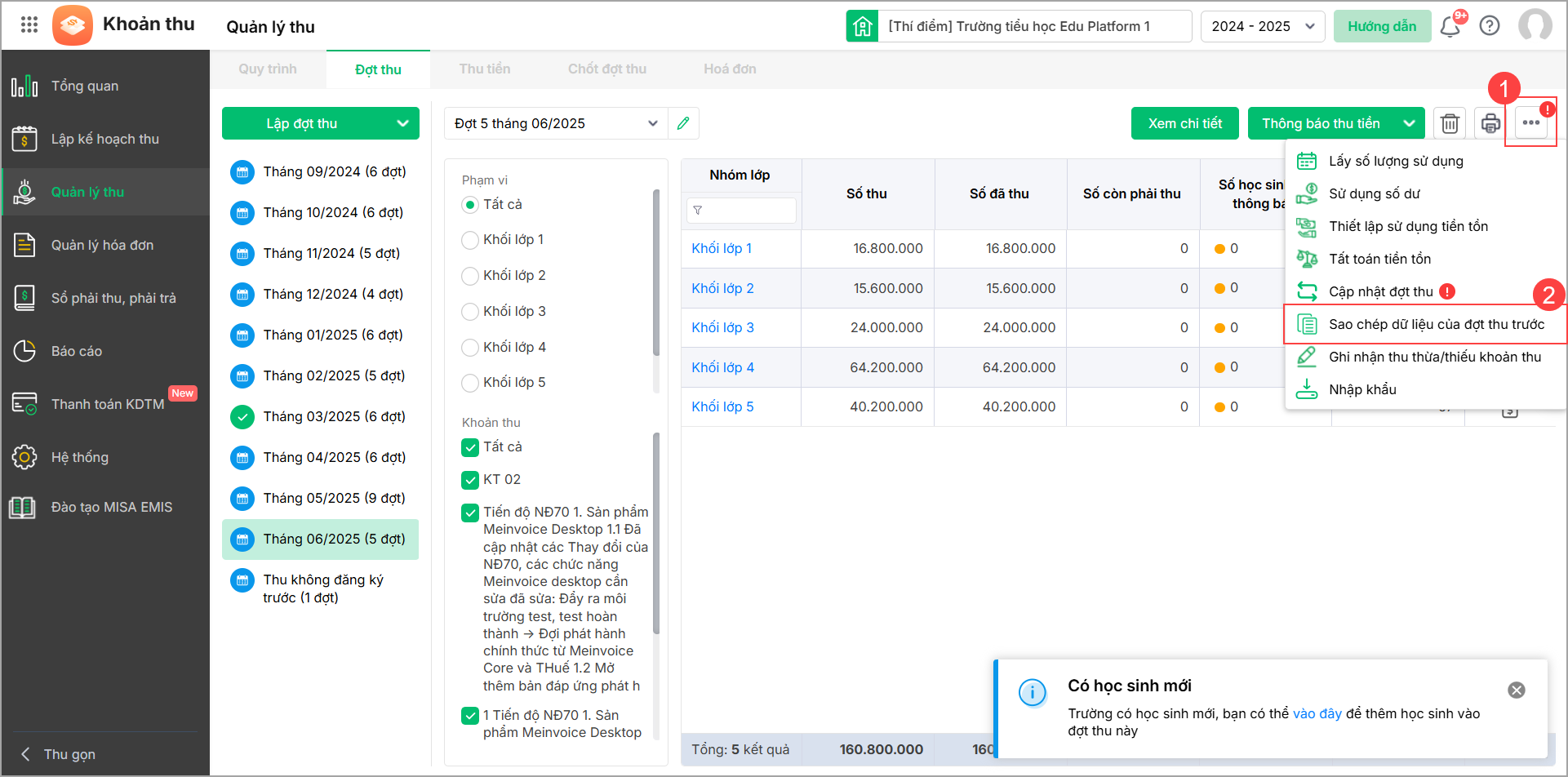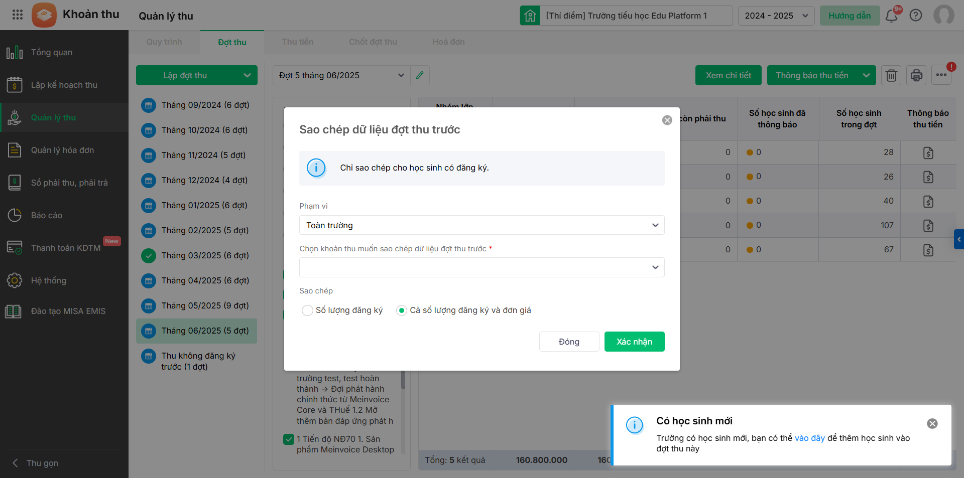 Trường hợp trong đợt thu trước, Kế toán đã có sẵn thông tin các khoản thu của học sinh và muốn sao chép nhanh thông tin lên đợt thu mới, anh chị thực hiện như sau:
