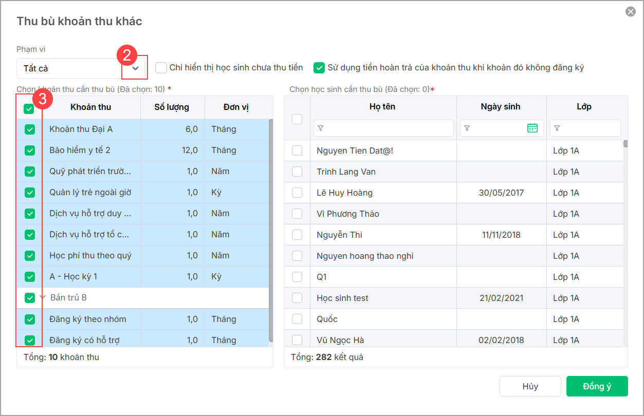 - Lựa chọn Phạm vi thu (Tất cả, Khối, Chưa xếp lớp) và tích chọn các Khoản thu cần thu bù, phần mềm tự động lấy lên danh sách học sinh.
