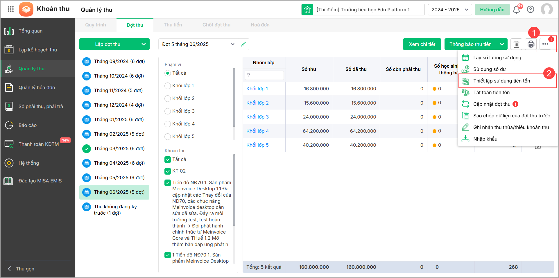 - Vào Quản lý thu\Đợt thu, chọn Thiết lập sử dụng tiền tồn.