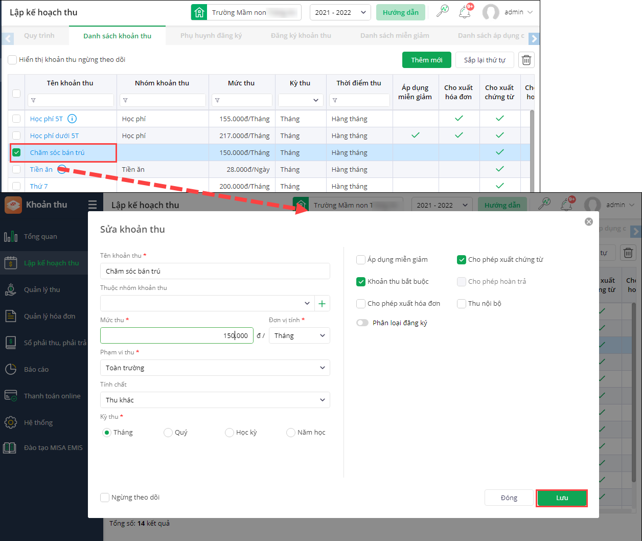 - Nếu có tích chọn khoản thu theo ngày thì bắt buộc phải nhập số buổi/tháng.