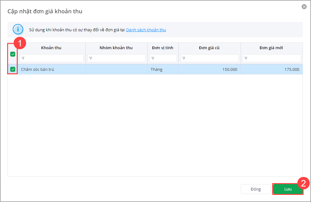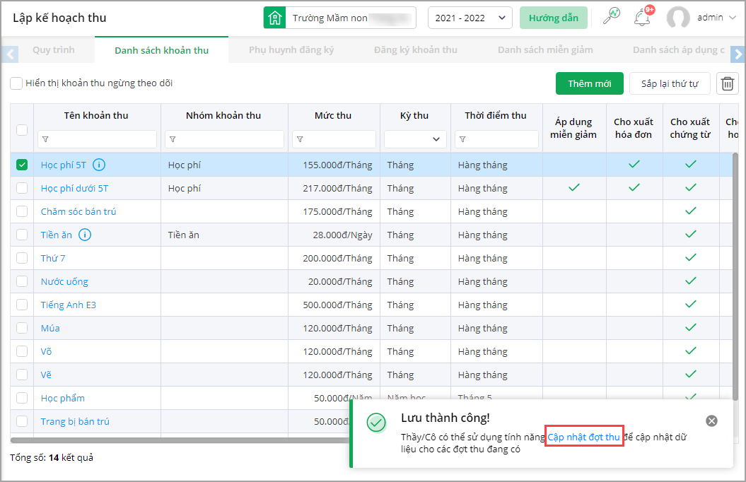 - Tích chọn khoản thu, nhấn Cập nhật.
