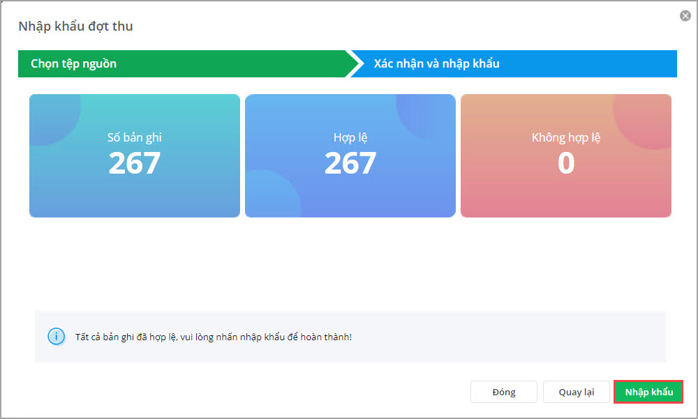 - Nhấn Tiếp tục, phần mềm chuyển sang bước Xác nhận và nhập khẩu.
