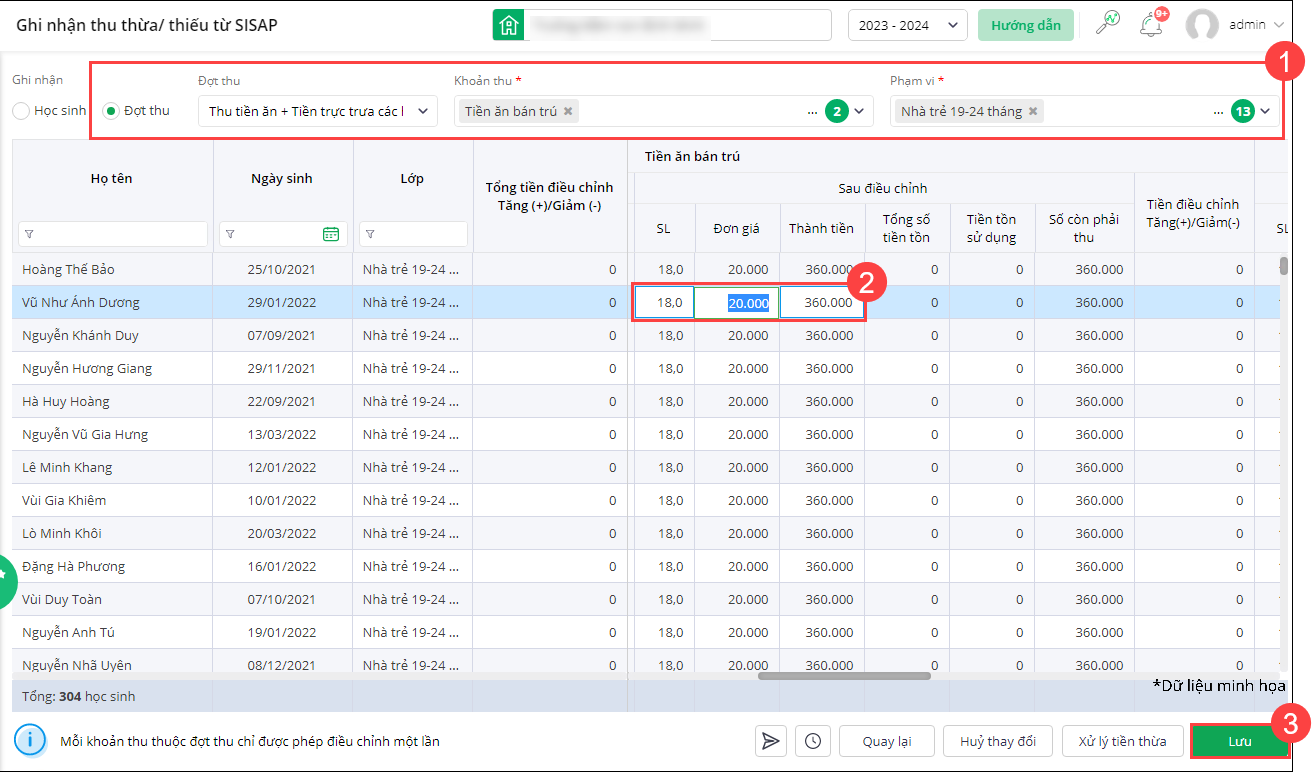- Sau khi hoàn tất nhấn Lưu. Với những số tiền phụ huynh nộp thừa qua SISAP, anh/chị thực hiện Xử lý tiền thừa. Cách thức ghi nhận là Ghi nhận thành số dư để dùng số tiền thừa đó bù trừ tháng sau. Nhấn Lưu.