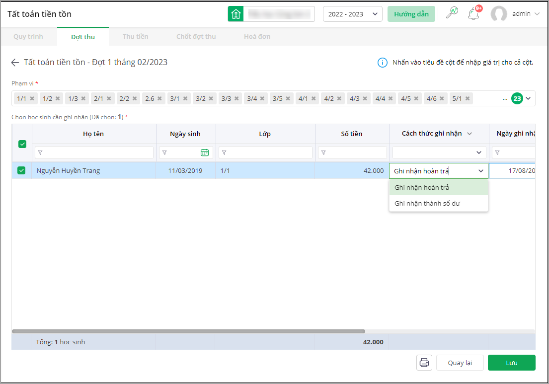 Giúp kế toán thiết lập cụ thể về việc hoàn trả tiền tồn cho học sinh.
