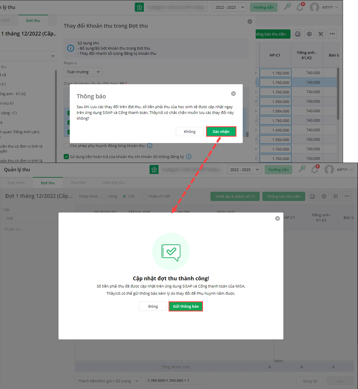 - Đối với đợt thu đã gửi thông báo thu tiền cho phụ huynh, sau khi cập nhật đợt thu, phần mềm sẽ hiển thị thông báo để Kế toán xác nhận và có thể gửi thông báo để phụ huynh chủ động nắm bắt thay đổi.