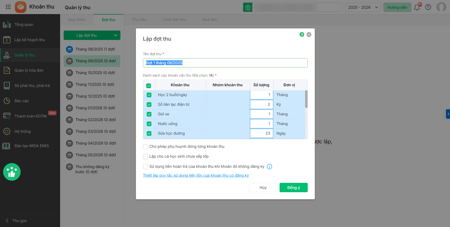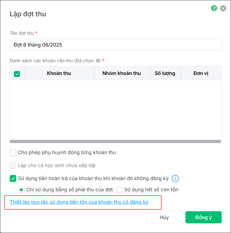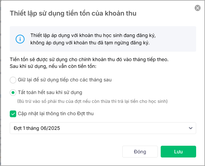 - Cập nhật lại thông tin cho Đợt thu: Tích chọn những khoản thu đã lập để cập nhật thiết lập sử dụng tiền tồn cho đợt thu đó.