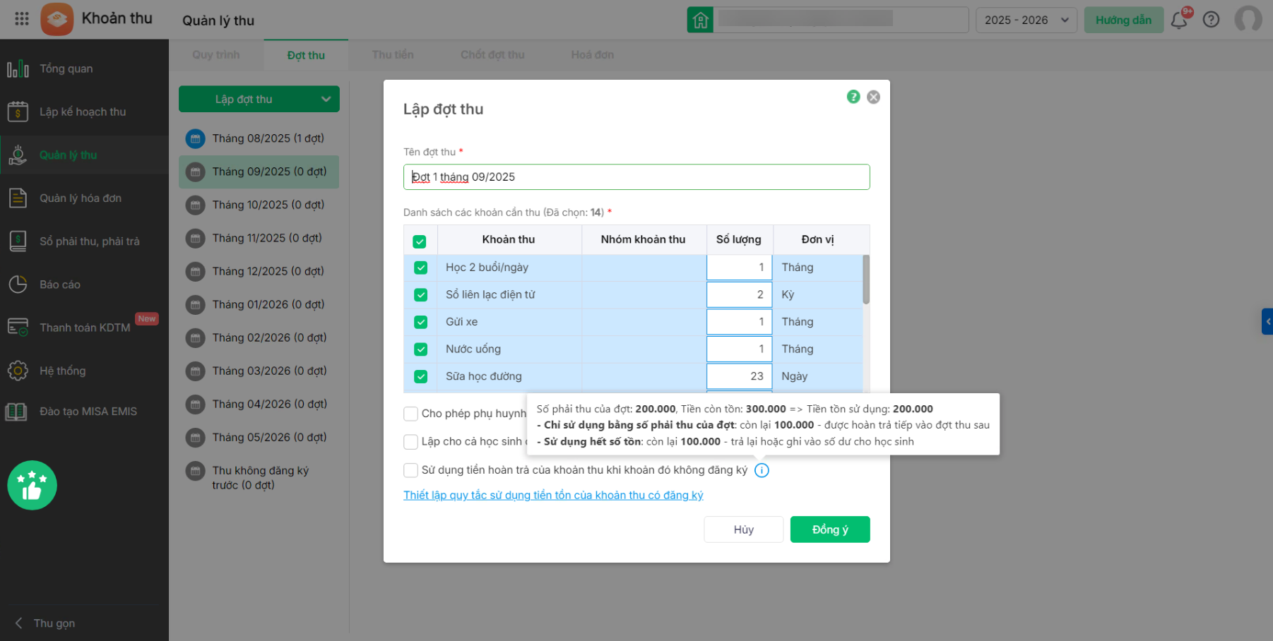 - Chỉ sử dụng bằng số phải thu của đợt: Ví dụ Số phải thu của học sinh là 200.000, Tiền tồn tháng trước là 300.000 => Phần mềm tự động số tồn là 200.000, tiền tồn còn lại 100.000 sẽ được sử dụng tháng sau cho Chính khoản thu đó hoặc Tất cả khoản thu.