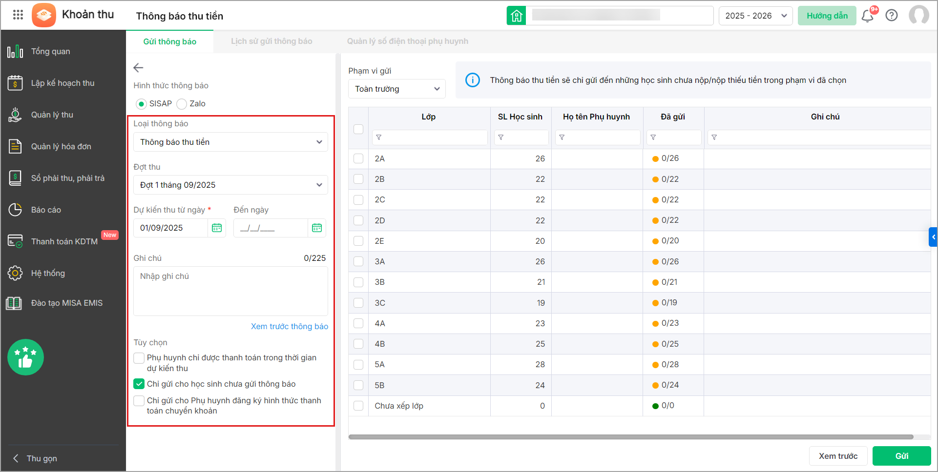 Mục đích: Thông báo cho phụ huynh về đợt thu tiền học vừa lập. Tùy theo nhu cầu của đơn vị, Nhà trường có thể lựa chọn hình thức gửi thông báo tiền học tới phụ huynh qua ứng dụng SISAP; tin nhắn Zalo của phụ huynh hoặc qua kênh thông tin của Nhà trường trên Zalo OA.