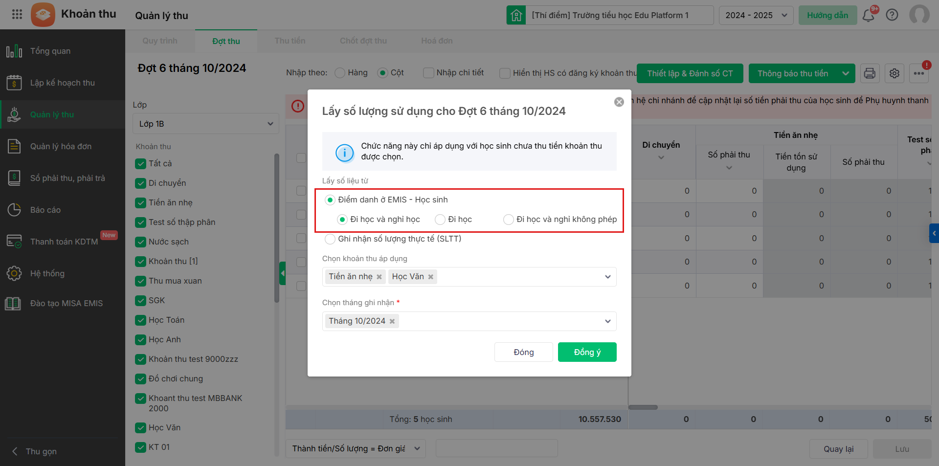 - Chọn Thời điểm số liệu điểm danh và chọn Khoản thu cần lấy số lượng sử dụng.
