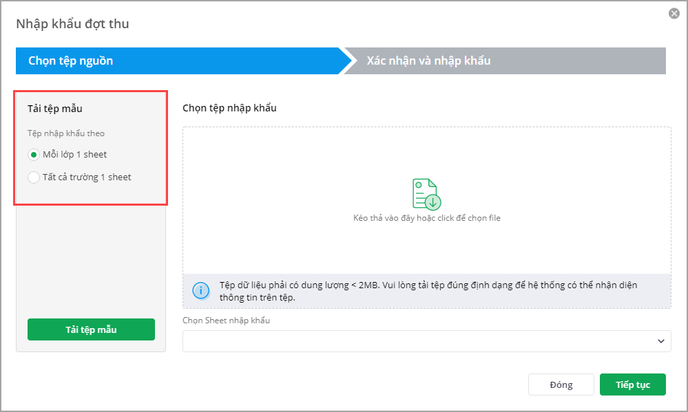 - Chọn hình thức tệp mẫu: Mỗi lớp 1 sheet hoặc Tất cả trường 1 sheet.
