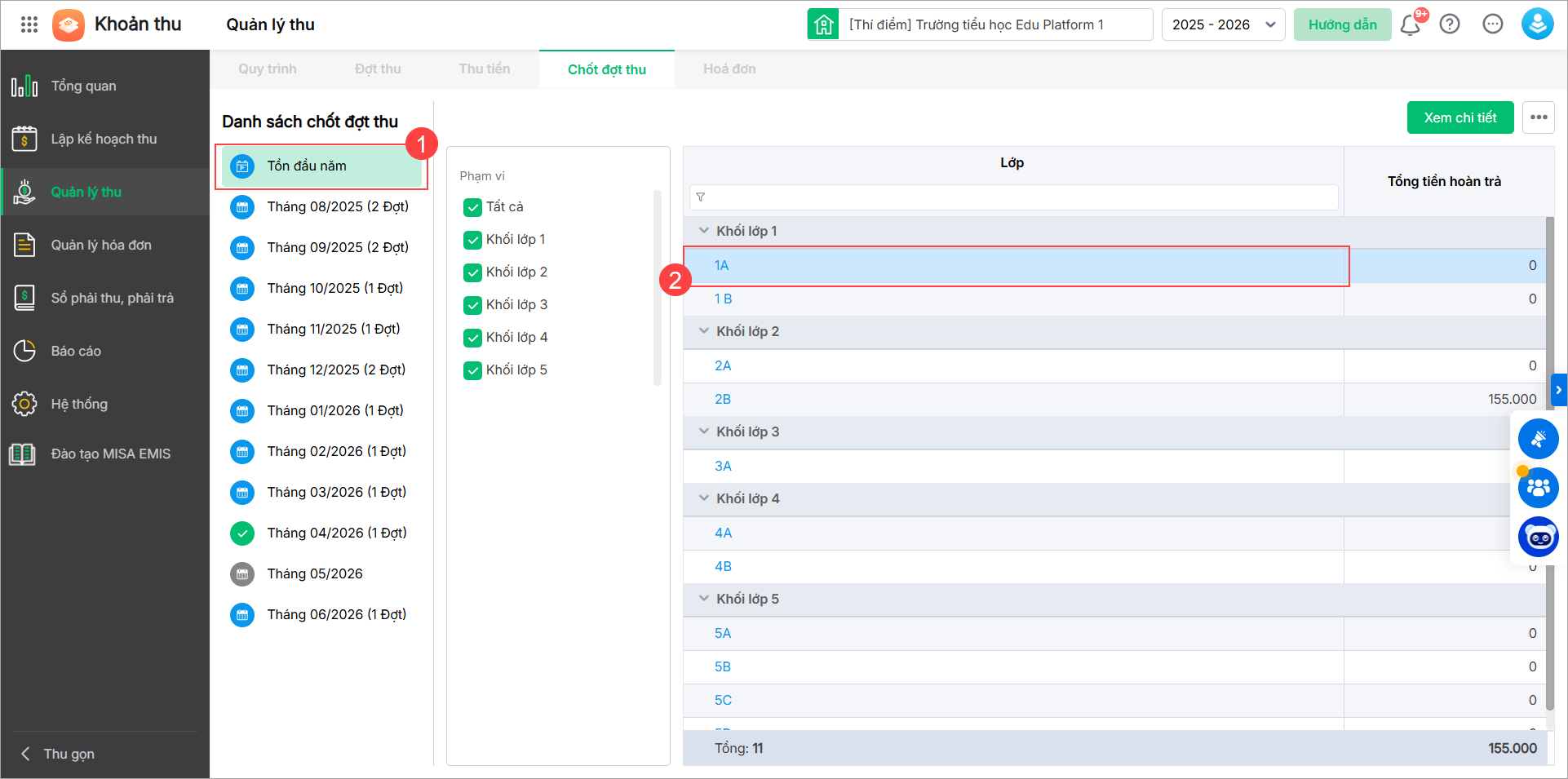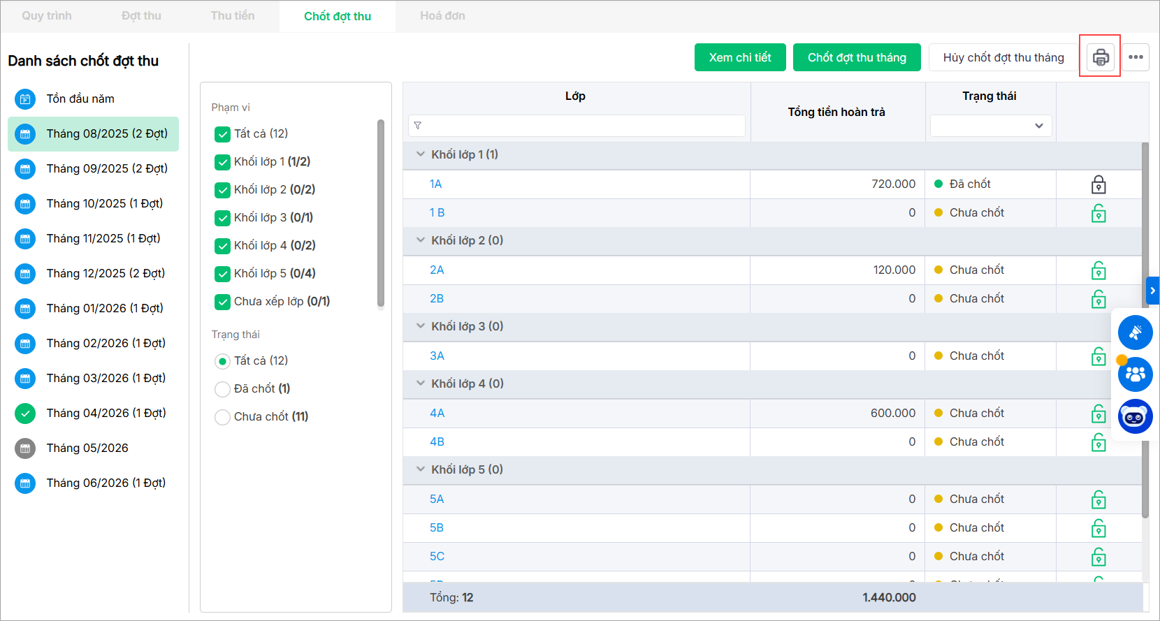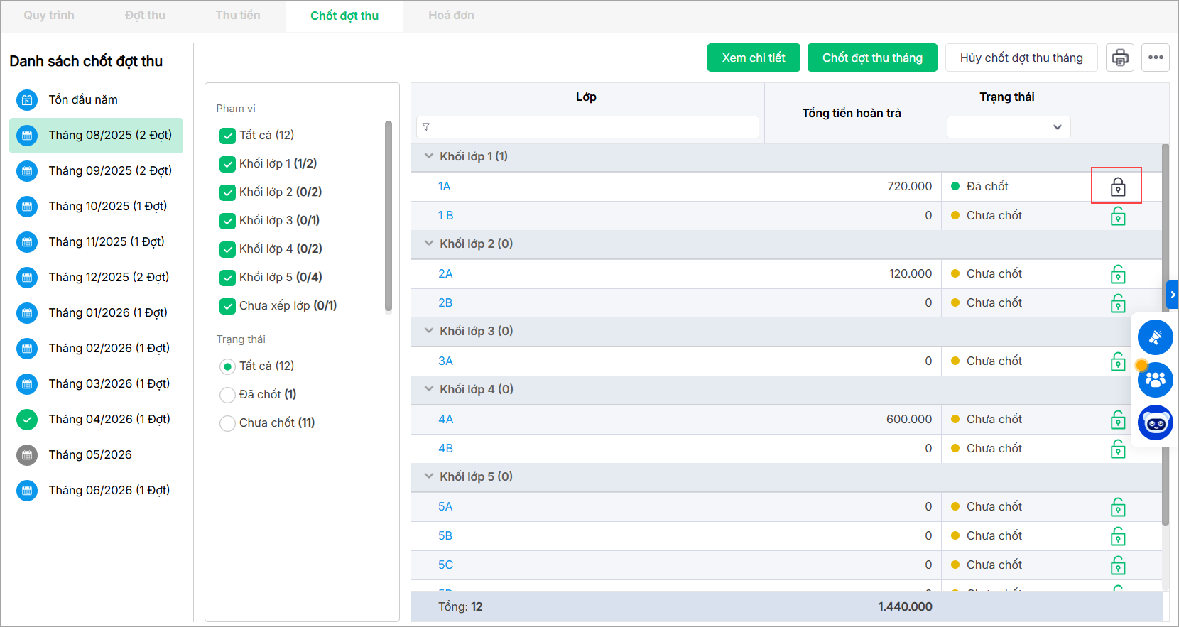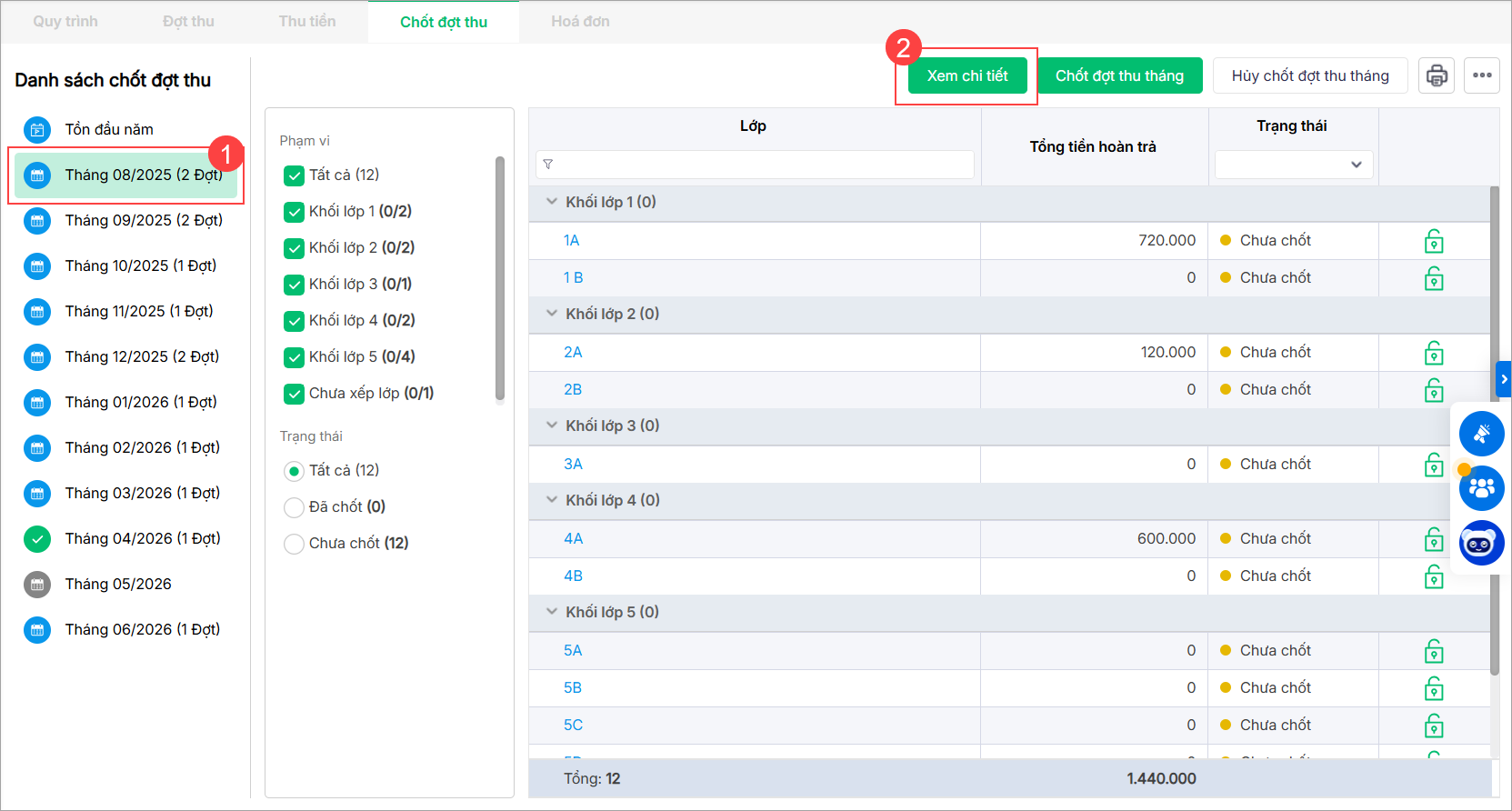 Trong trường hợp không phát sinh học sinh nào có tiền hoàn trả, anh/chị thực hiện Chốt đợt thu tháng cho tất cả các lớp chưa chốt và tất cả các đợt thu tháng đó.