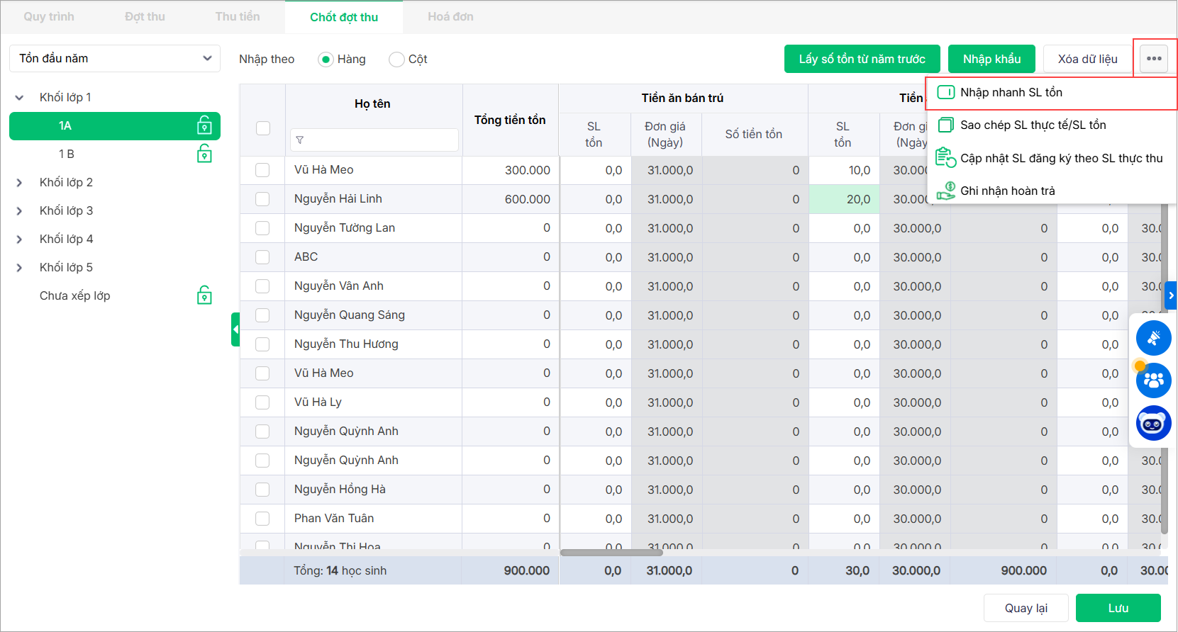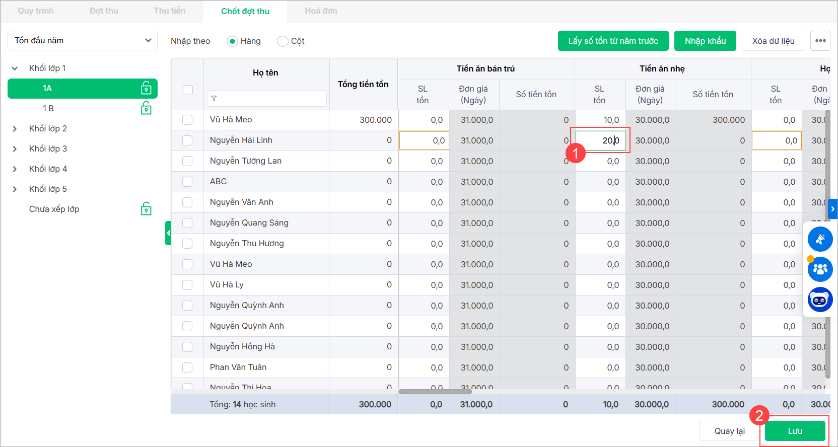 2. Nhập số lượng tồn tương ứng với mỗi học sinh trong lớp, nhấn Lưu để lưu thông tin.