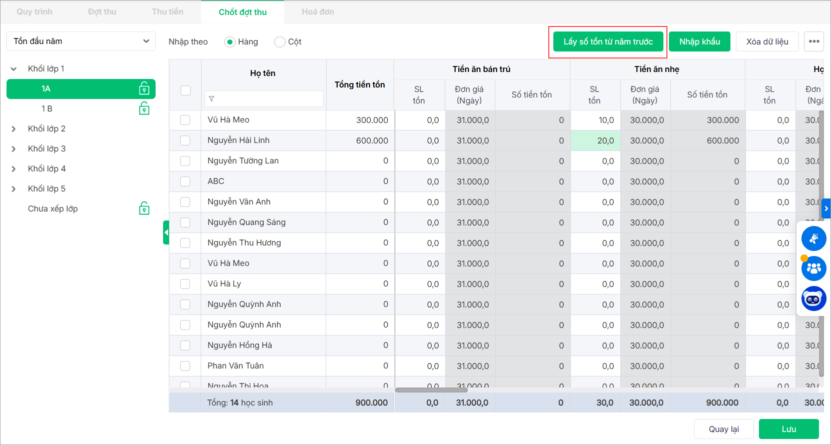 • Để lấy số tồn của năm học trước, nhấn Lấy số tồn từ năm trước.