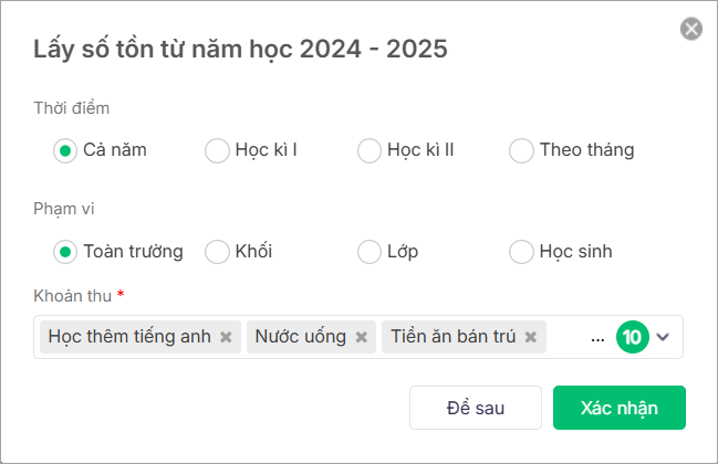 • Vào Khoản thu\Quản lý thu\Chốt đợt thu, chọn Tồn đầu năm.