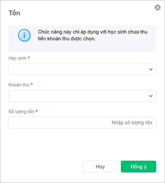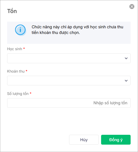 2. Chọn học sinh, khoản thu và nhập Số lượng tồn, nhấn Đồng ý.