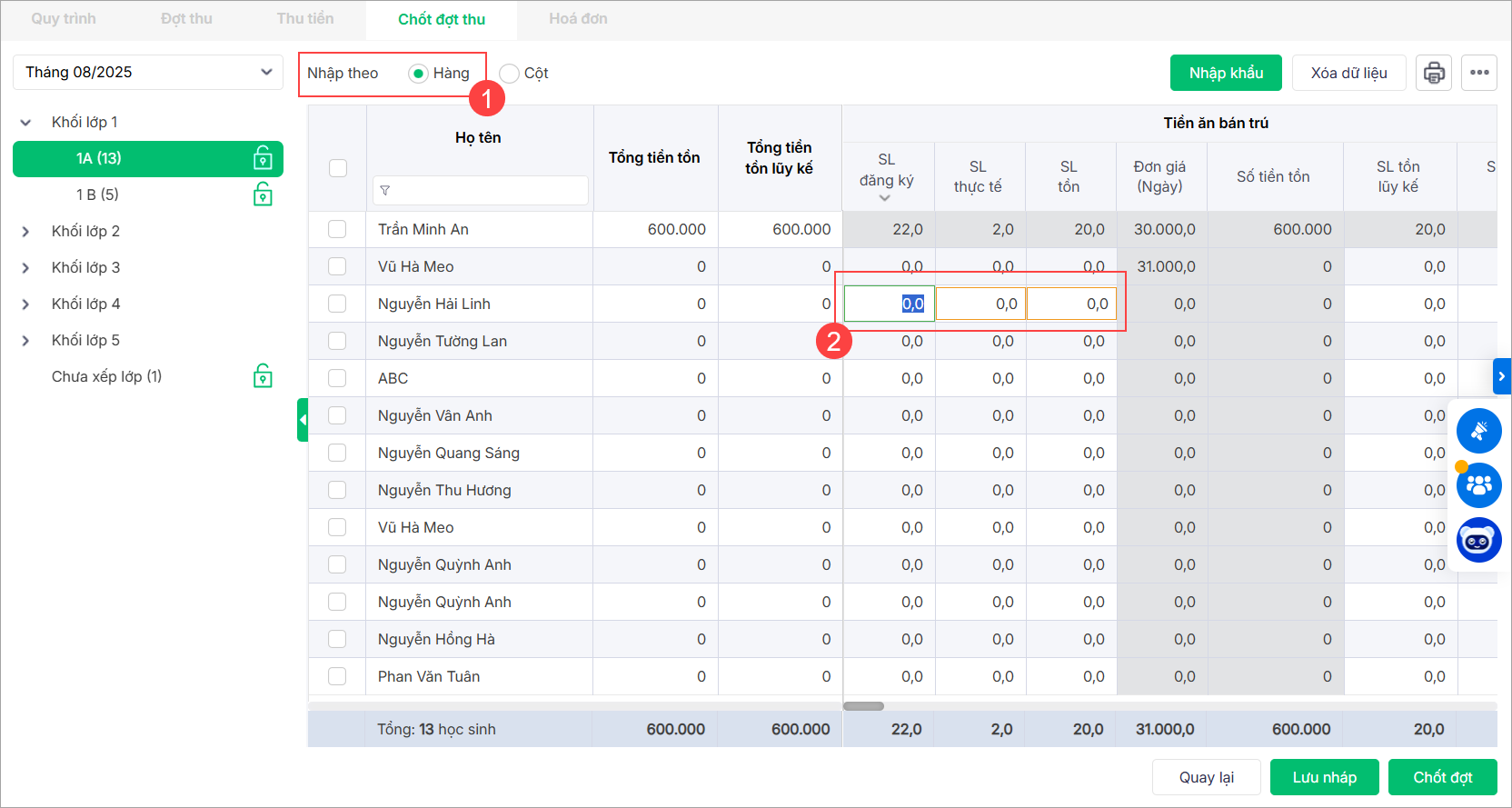 1. Để chỉnh sửa số lượng các khoản thu cho từng học sinh, anh chọn Nhập theo Hàng để nhập nhanh SL đăng ký; SL thực tế hoặc SL tồn của học sinh đó.