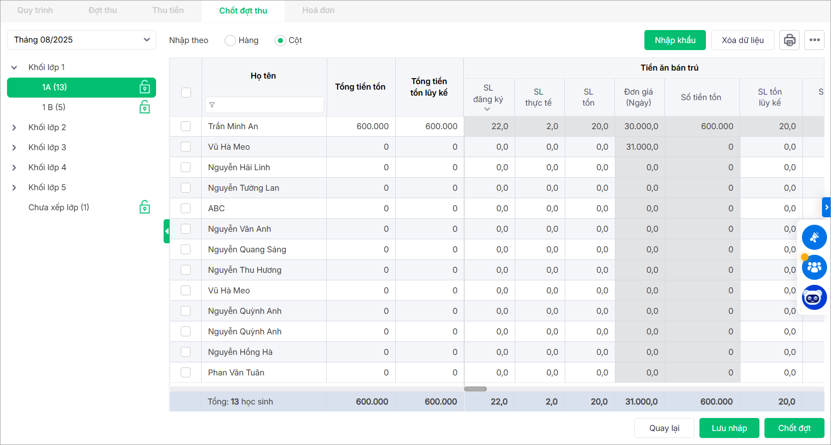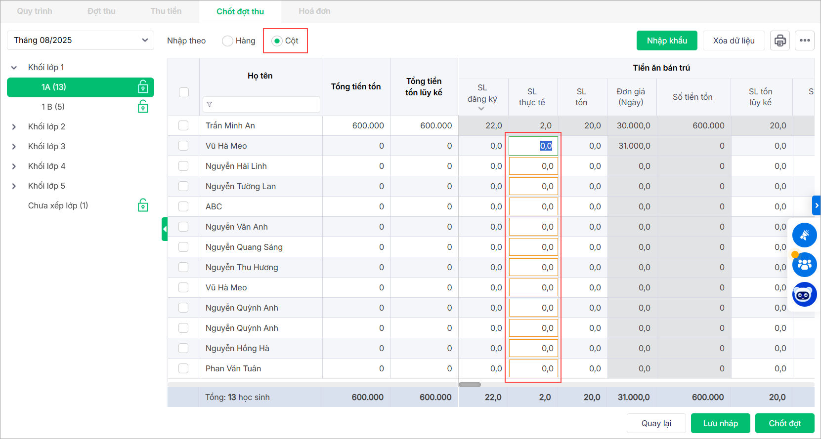 2. Để chỉnh sửa số lượng khoản thu cho hàng loạt học sinh, anh chọn Nhập theo Cột và nhập nhanh SL đăng ký; SL thực tế hoặc SL tồn của cả lớp.