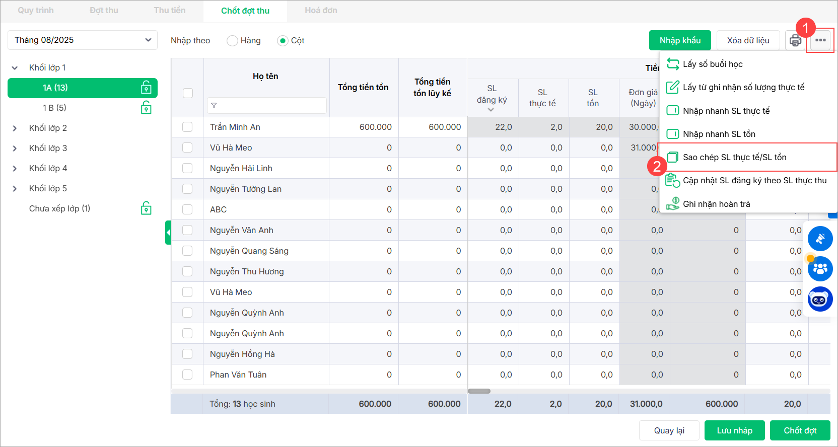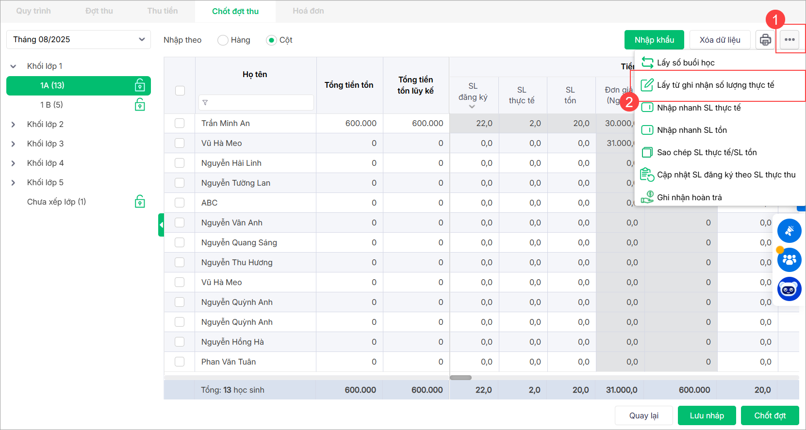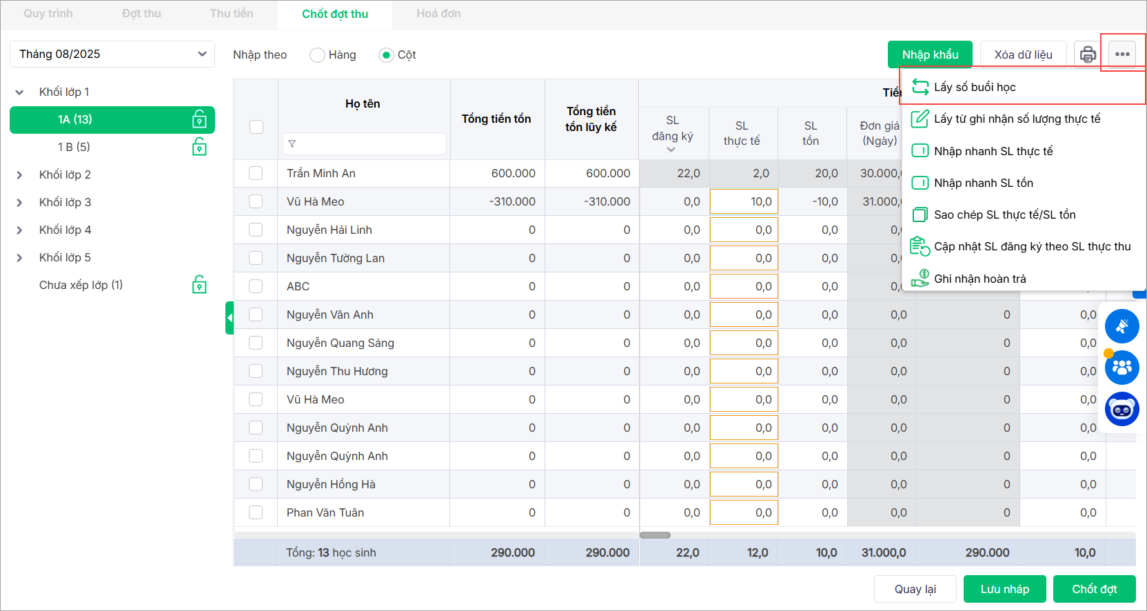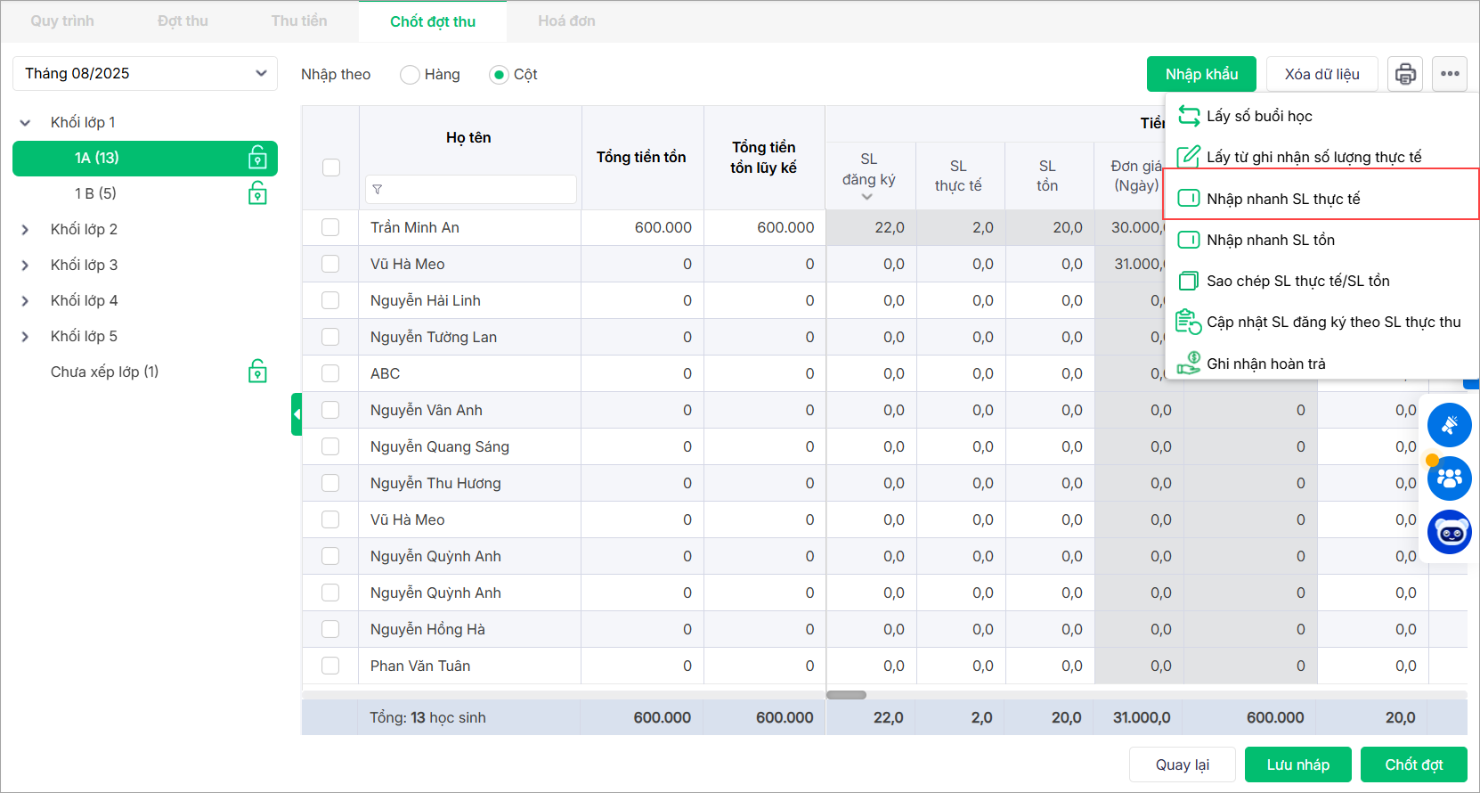 1. Nhấn vào biểu tượng ba chấm, chọn Nhập nhanh SL thực tế để ghi nhận nhanh số lượng sử dụng thực tế của học sinh.