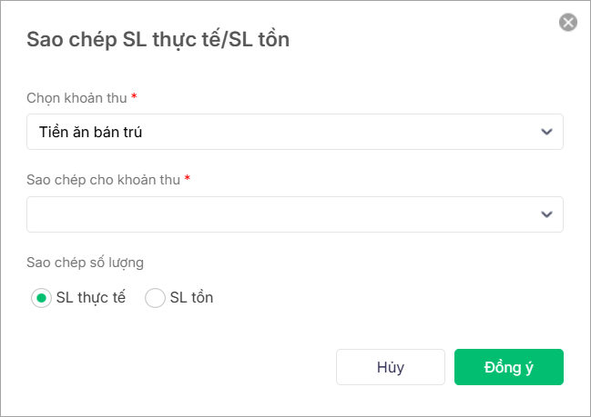 2. Chọn Khoản thu sao chépkhoản thu sao chép đến. Chọn số lượng cần sao chép là SL thực tế hoặc SL tồn.