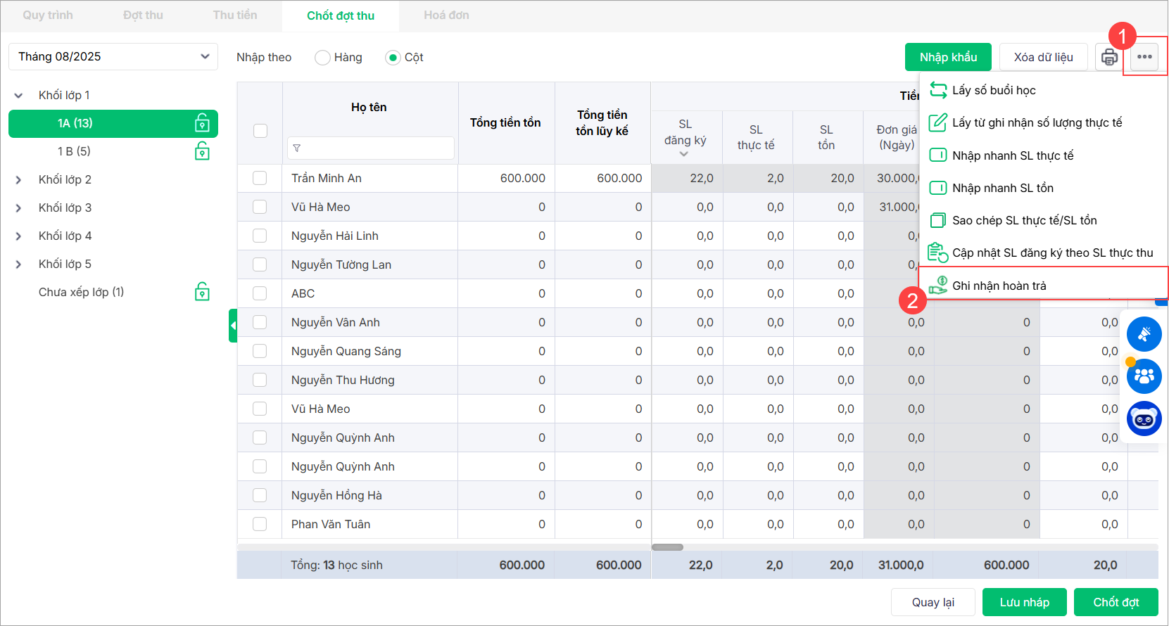 Trường hợp đã lập đợt thu của tháng mới, kế toán muốn cập nhật lại số buổi thực tế/hoàn trả của học sinh của tháng trước nếu có sai sót.