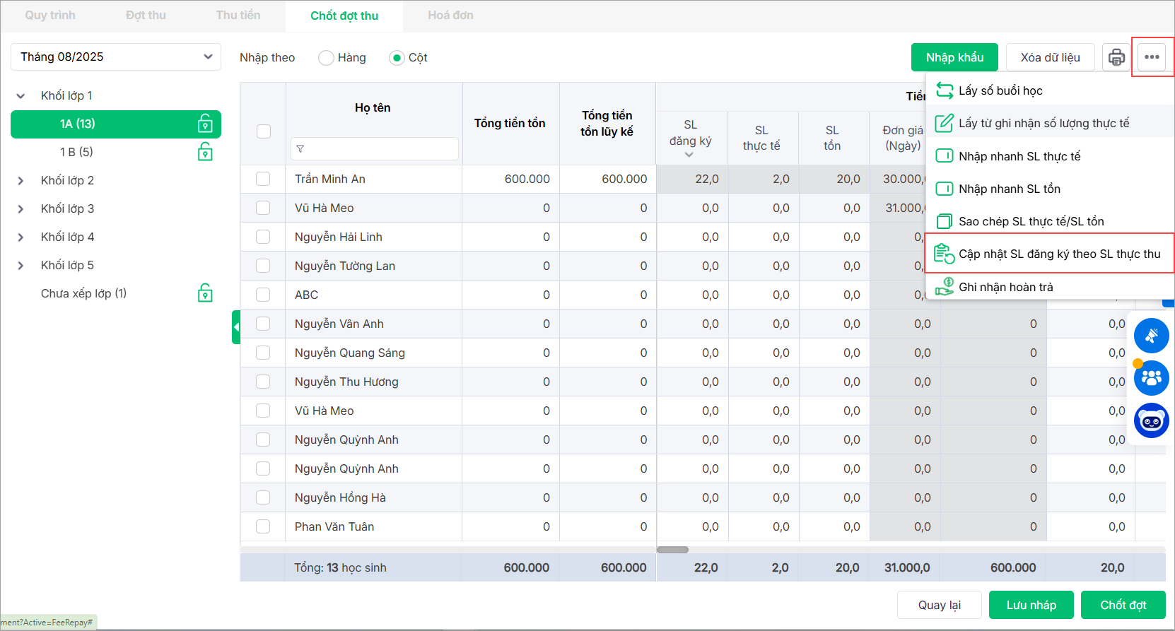 1. Nhấn vào biểu tượng ba chấm, chọn Cập nhật SL đăng ký theo SL thực thu.