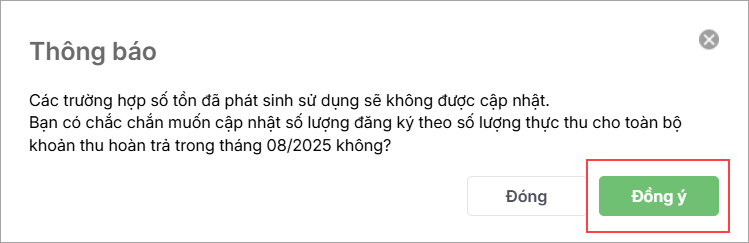 2. Xác nhận cập nhật số lượng đăng ký theo số lượng thực thu cho toàn bộ khoản thu hoàn trả trong tháng. Lưu ý các trường hợp phát sinh số tồn sử dụng sẽ không được cập nhật.