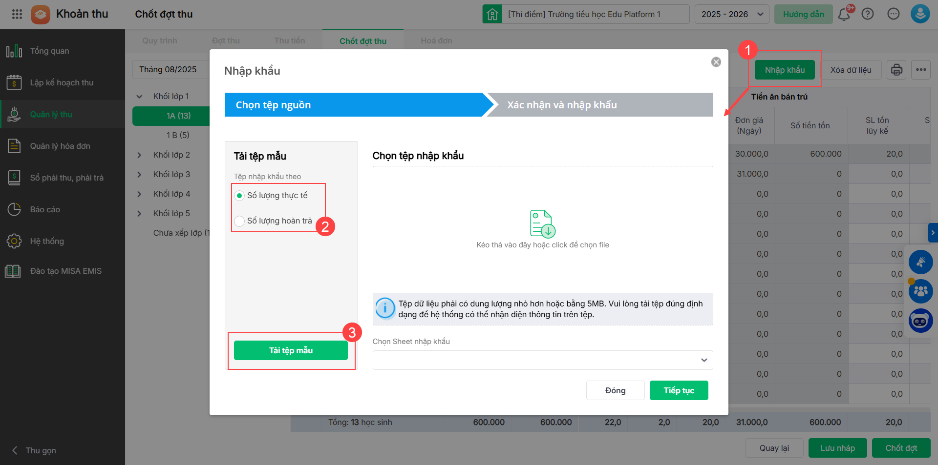 Mục đích: Giúp kế toán chốt các đợt thu trong tháng, sau khi đơn vị thực hiện thu tiền nếu trường có phát sinh khoản thu theo ngày, buổi, tiết, thu trước vào đầu tháng và hoàn trả số tiền thừa cuối tháng này vào đầu tháng sau.
