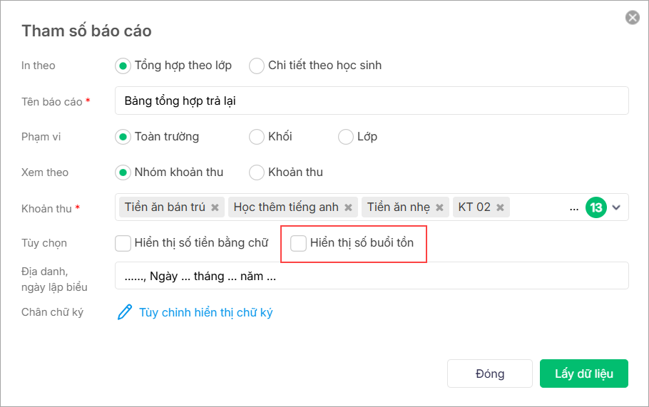• Trường hợp in theo Tổng hợp theo lớp, tích chọn Hiển thị số buổi tồn để lấy lên  số lượng buổi tồn của khoản thu/nhóm khoản thu cho phép hoàn trả tương ứng.