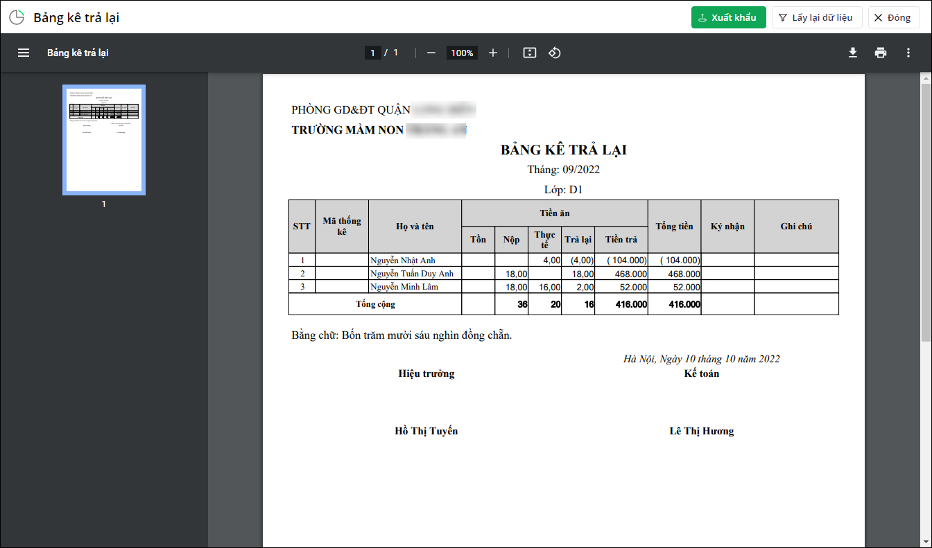 Sau khi chốt đợt thu, kế toán có thể in Bảng tổng hợp trả lại (Theo lớp) hoặc Bảng kê trả lại (Chi tiết theo học sinh) để hoàn trả lại tiền thừa cho phụ huynh ký xác nhận: