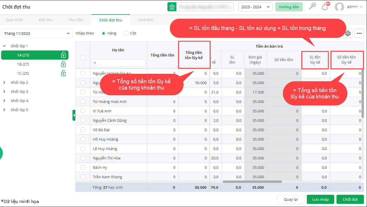 • Tổng số tiền tồn lũy kế = Tổng số tiền tồn lũy kế của từng khoản thu.
