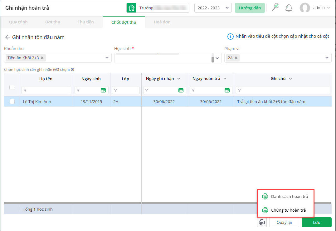1. Nhấn vào biểu tượng dấu ba chấm, chọn Ghi nhận hoàn trả, chọn khoản thu, phạm vi khối, lớp cần hoàn trả.