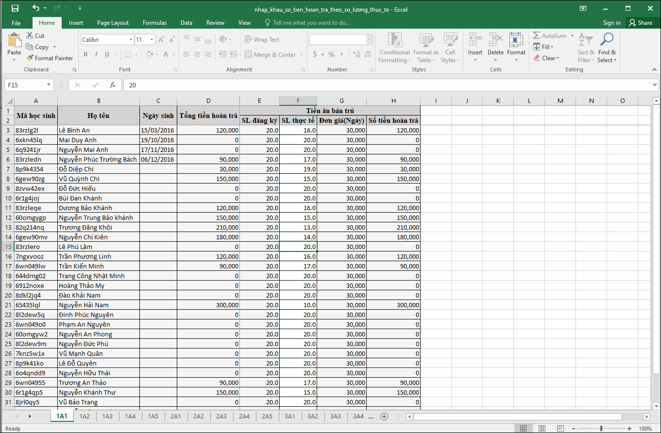 Giúp kế toán ghi nhanh số buổi sử dụng của các khoản thu hoàn trả khi học sinh đều sử dụng số buổi giống nhau của các khoản thu này.