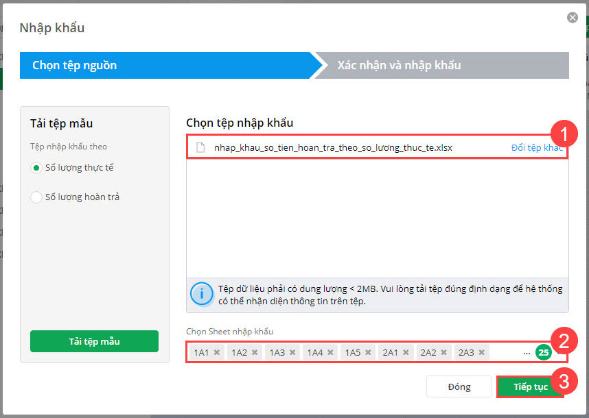 4. Tải lên tệp excel để nhập khẩu vào phần mềm, chọn sheet muốn nhập khẩu. Nhấn Tiếp tục.