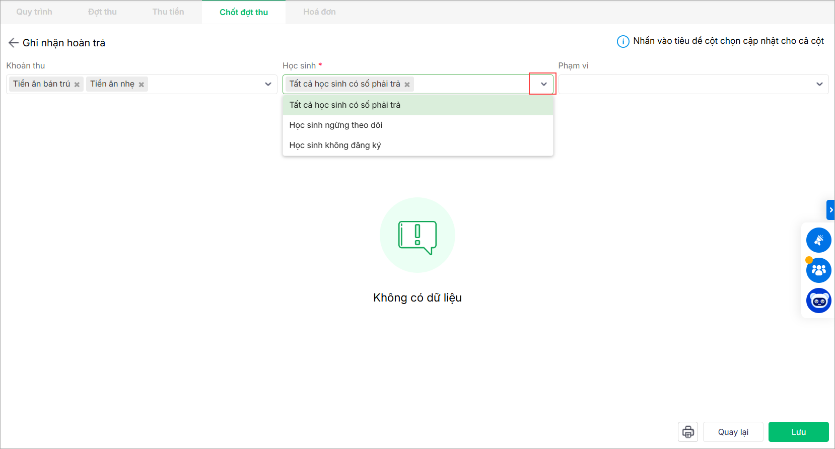 2. Lựa chọn Khoản thu; Phạm viTrạng thái học sinh cần ghi nhận hoàn trả: