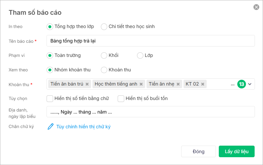 • Trường hợp in theo Tổng hợp theo lớp, tích chọn Hiển thị số buổi tồn để lấy lên  số lượng buổi tồn của khoản thu/nhóm khoản thu cho phép hoàn trả tương ứng.