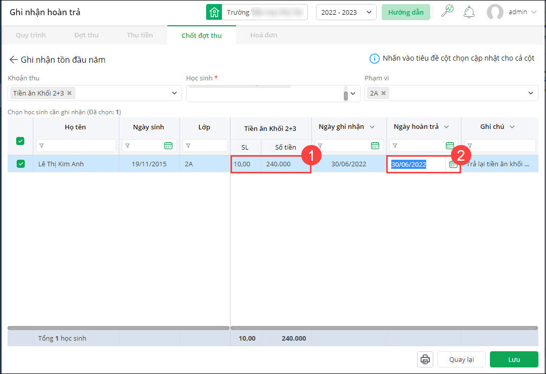 3. Tích chọn những học sinh cần ghi nhận hoàn trả. Anh/chị thiết lập thông tin hoàn trả của từng học sinh tương ứng: