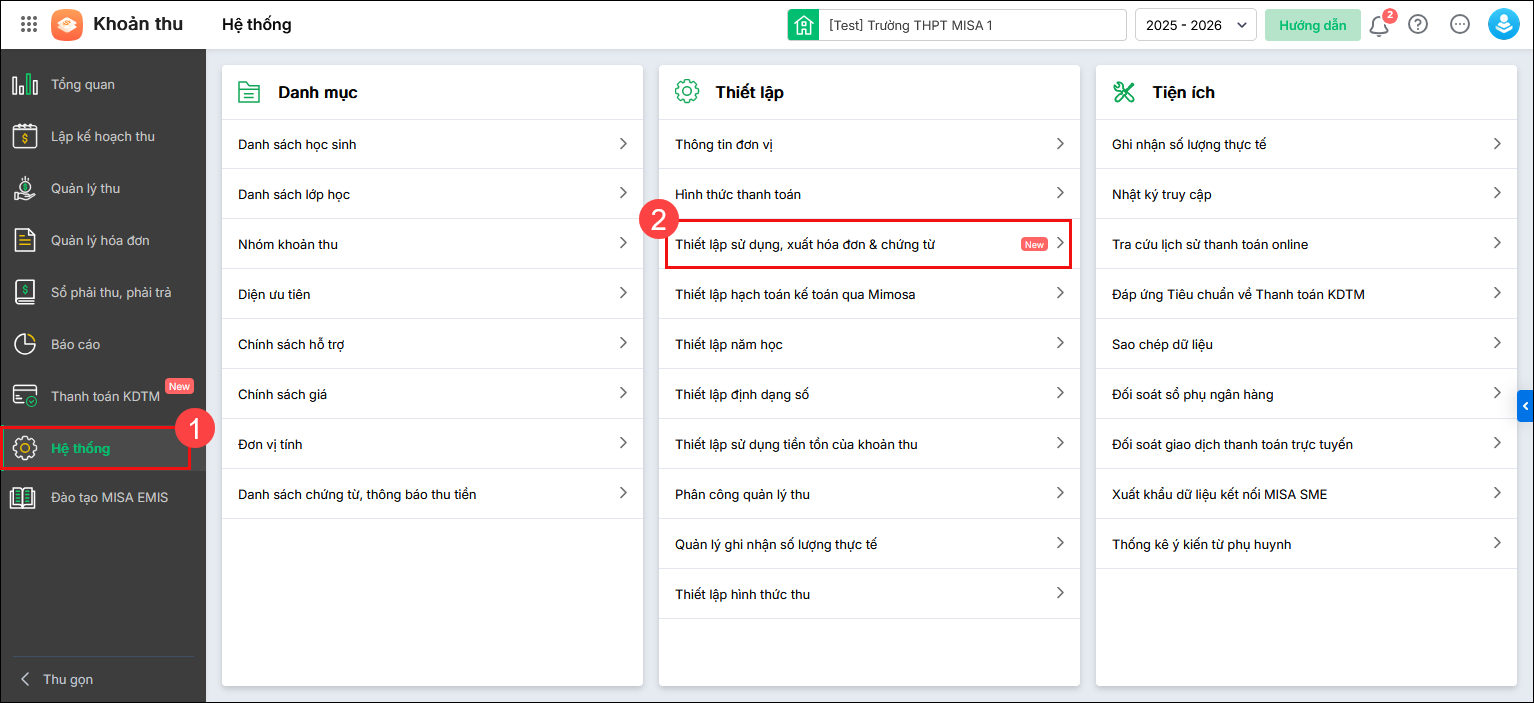 Bước 1: Vào Hệ thống\Thiết lập sử dụng hóa đơn, chứng từ.