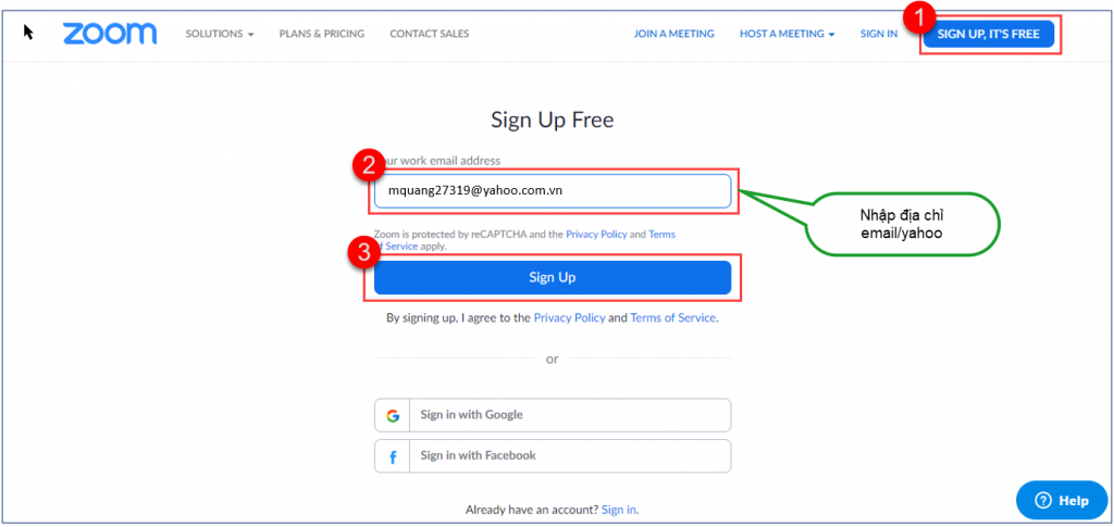 - Nhập địa chỉ gmail/yahoo, nhấn Sign Up (Đăng ký)