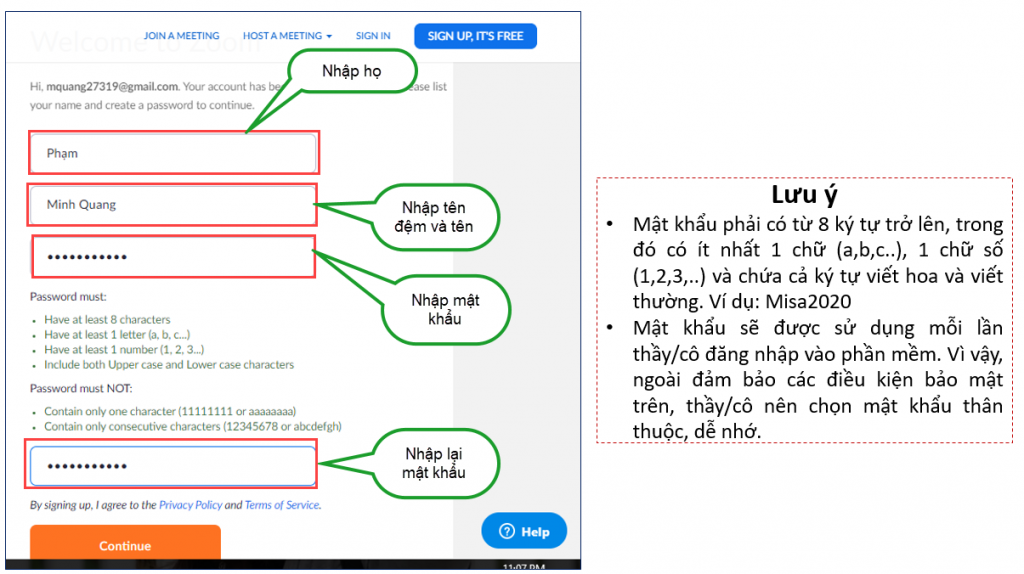 Lưu ý: Nếu không thấy tin nhắn của Zoom trong hộp thư đến, anh chị hãy kiểm tra mục Spam/Thư rác - Tiếp tục khai báo các thông tin khởi tạo như Tên, Mật khẩu, nhấn Continue/Tiếp tục